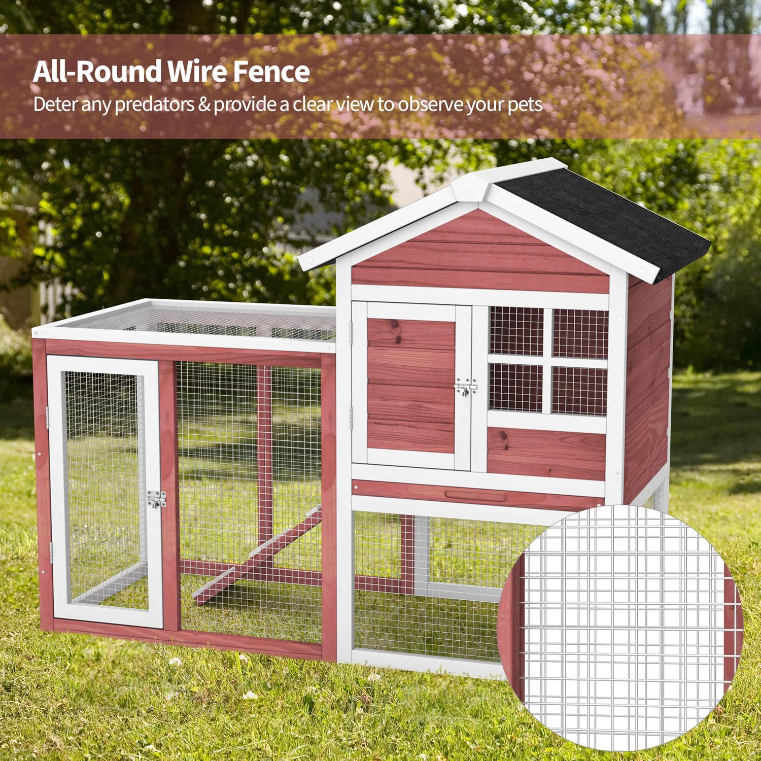 A Cozy & Comfortable House for Your Lovely Little Friends! Our 2-story wooden rabbit hutch is designed with a large running area for exercise and sunbath and a raised house for feed and sleep, and there exists a non-slip ramp connecting the 2 places. Besides, the pet house is made of solid fir wood that is sturdy and durable for long-term uses. Also, the surface is painted with non-allergic and safe varnish. More than that, it is enclosed with high-quality wire fences that could not block out sunlight but also protect your lovely pets from attacks by predators. And thanks to the asphalt roof and waterproof surface, the wooden rabbit cage can resist sun and rain which is perfect for outdoor use. There also exists 2 lockable doors for easy access and a pull-out tray for easy cleaning. It would not only be a cozy house for your pets but also an addition to your backyard landscapes!