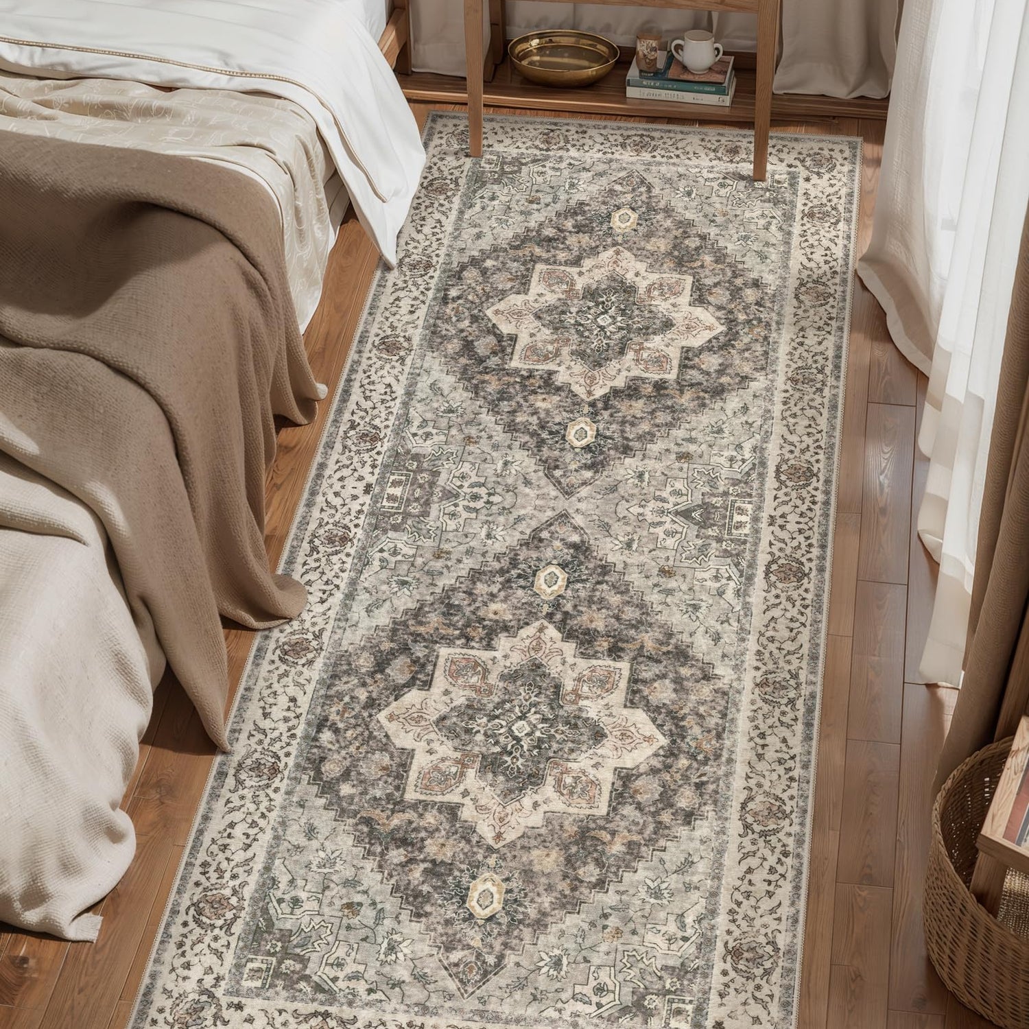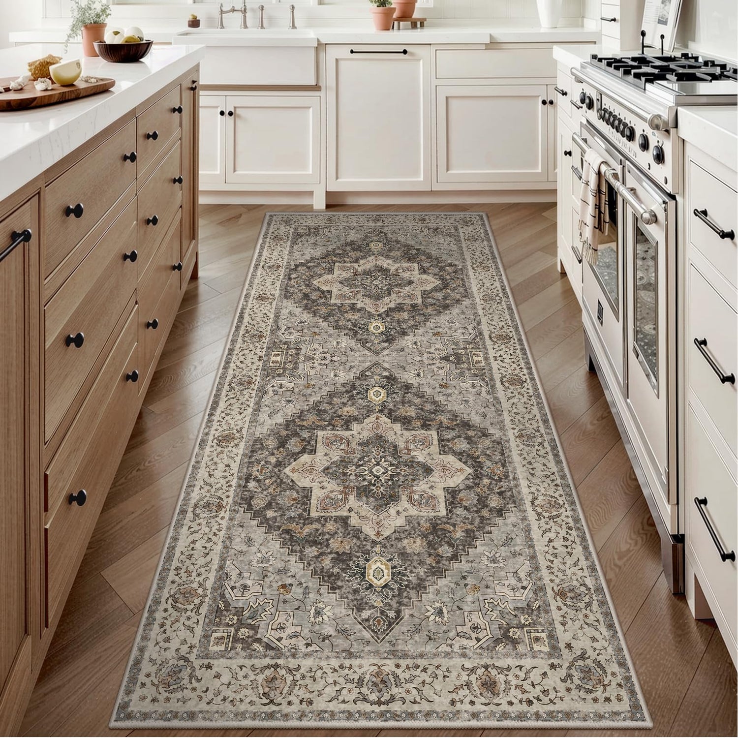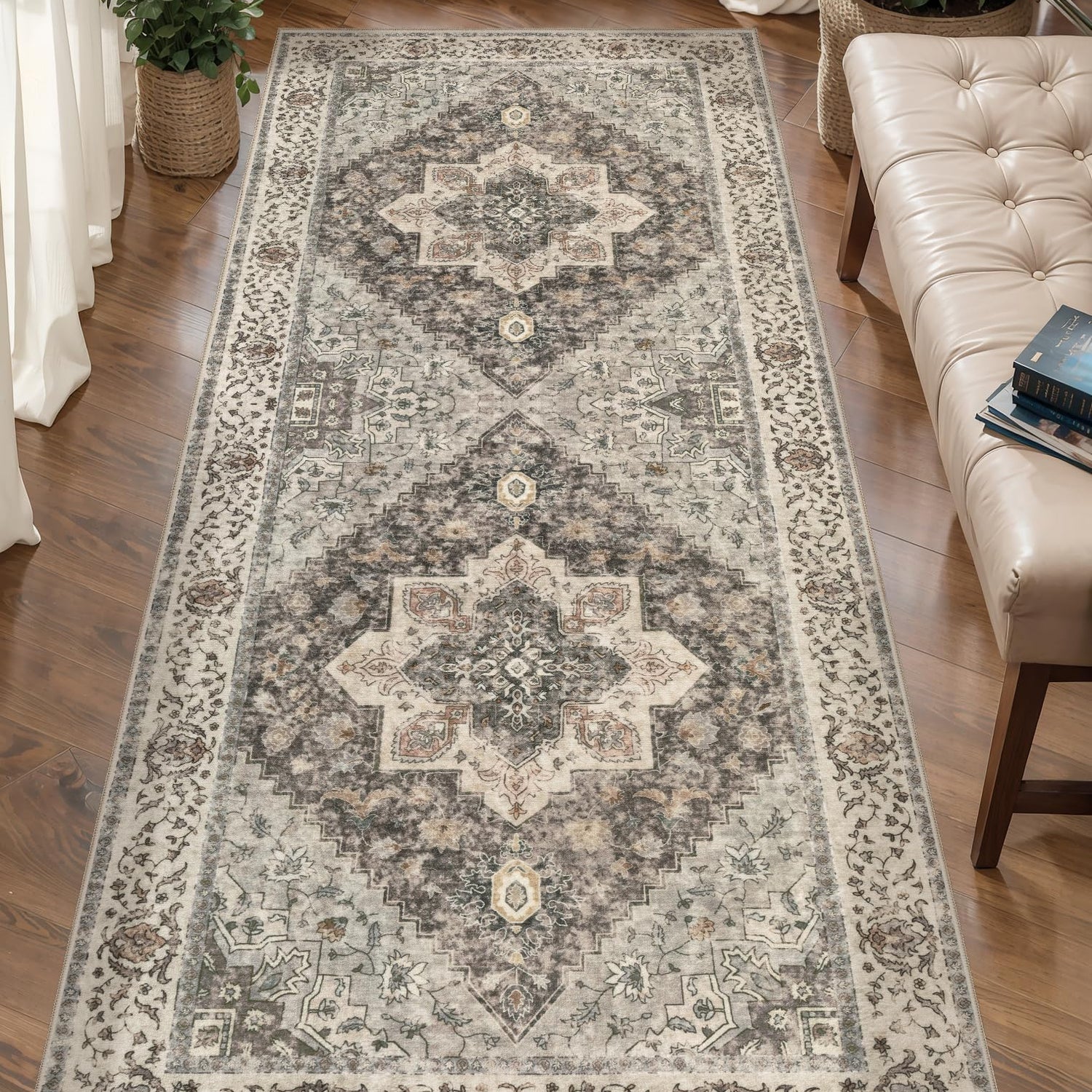 Tangsoo 2x6 Washable Runner Rug for Hallways, Non Slip Vintage Runner Rug, Soft Low Pile Long Rug Runner, Print Distressed Brown/Grey Carpet Runners for Kitchen Bedroom Entryway Bathroom Living Room