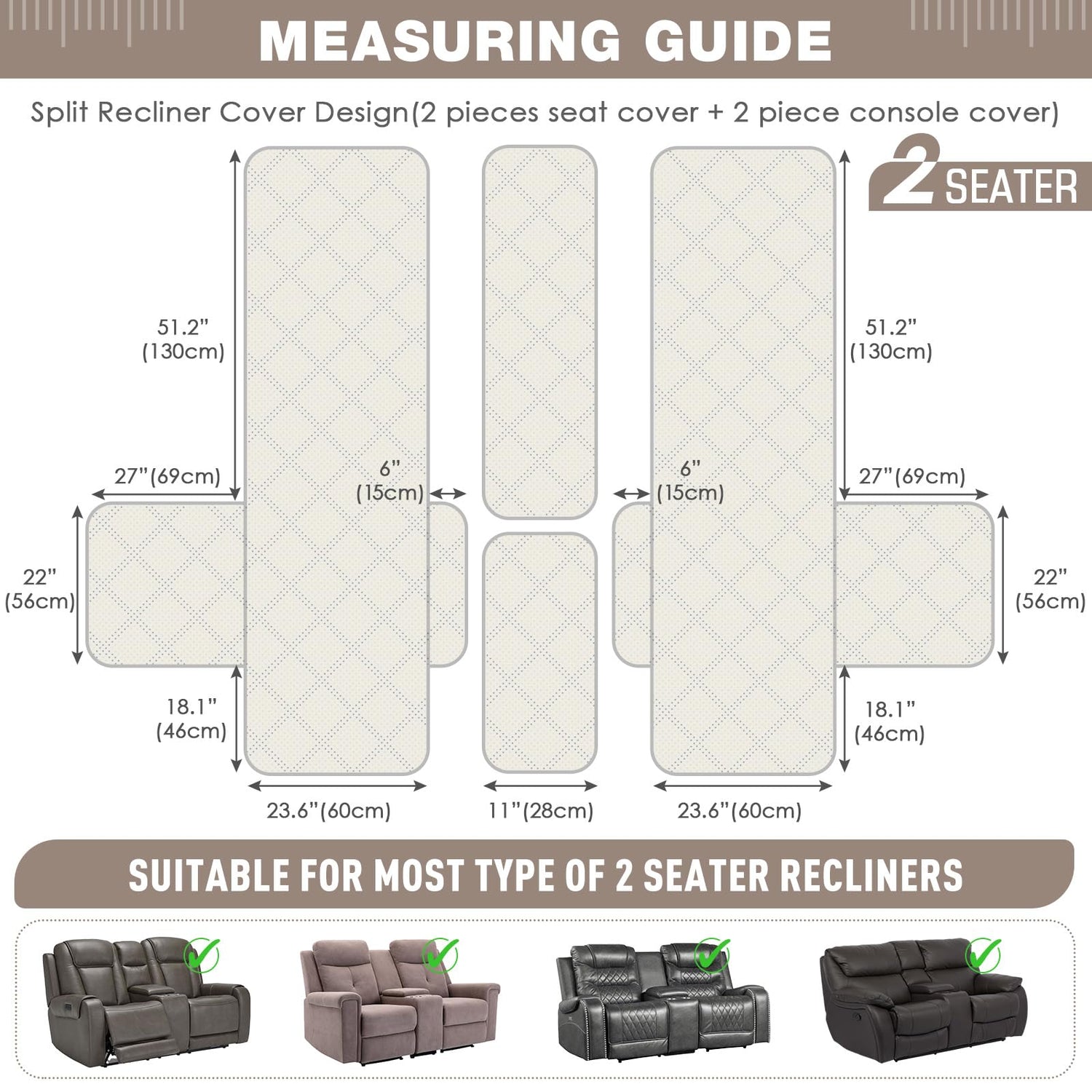 - 【DIMENSIONS GUIDE】2 seater recliner cover fit the sofa with each seat width of 23.6 in, see measurement guide in photos. Thanks to the separated design of our recliner sofa cover, it can be fitted into more styles of recliner sofa(with center console and cup holder). Please measure the size of your sofa before purchasing