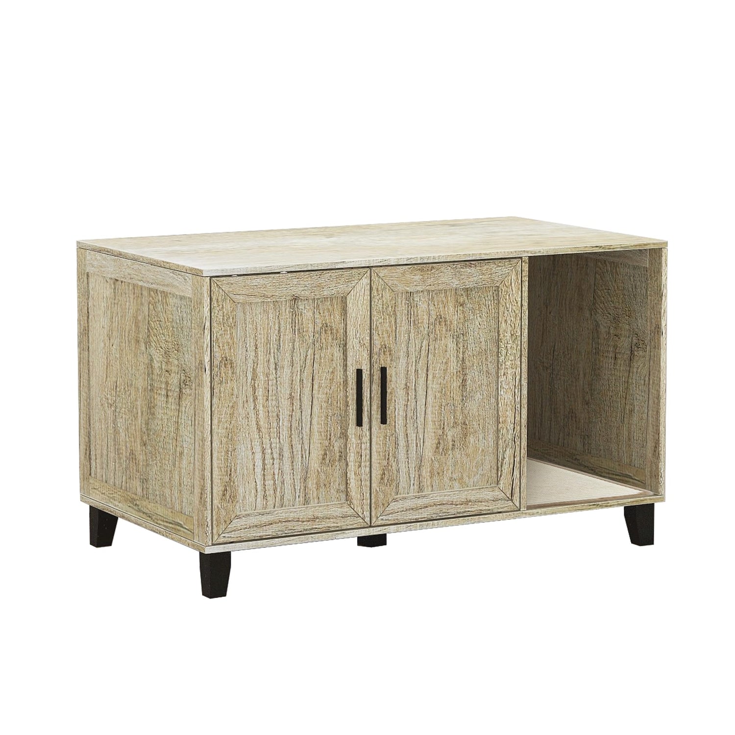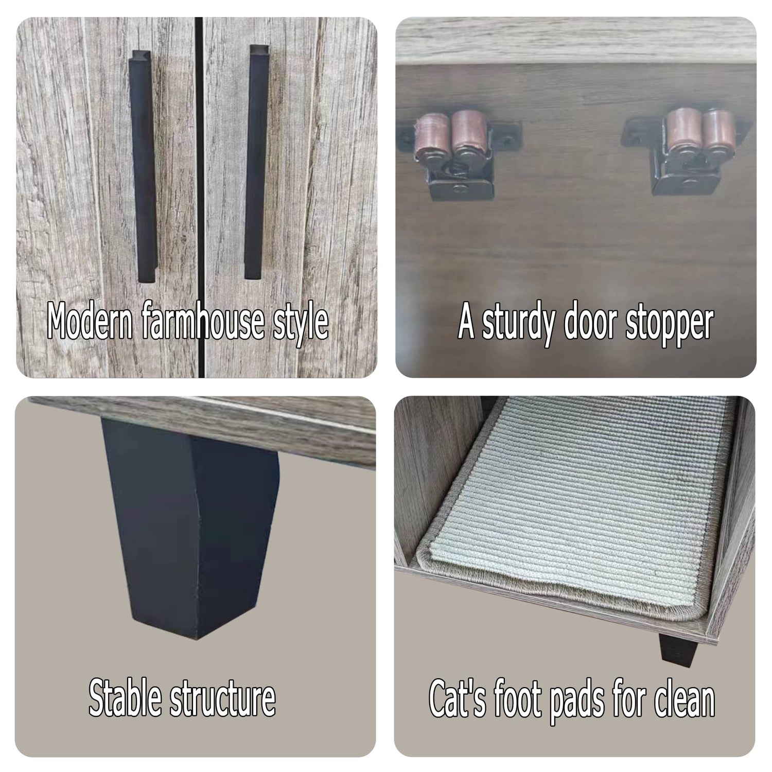 - Stylish Cat Litter Box Enclosure Furniture: Black handles and table legs match perfectly with farmhouse style and oak color. The double doors allow you to store cat food and clean litter. The 3 ventilation holes on the back panel enhance the air permeability. Even if your cat stays inside for a long time, it can still breathe fresh air. The open side is designed with foot pads to prevent the cat litter from being dragged out and provide a place for cats to play and sharpen their claws.