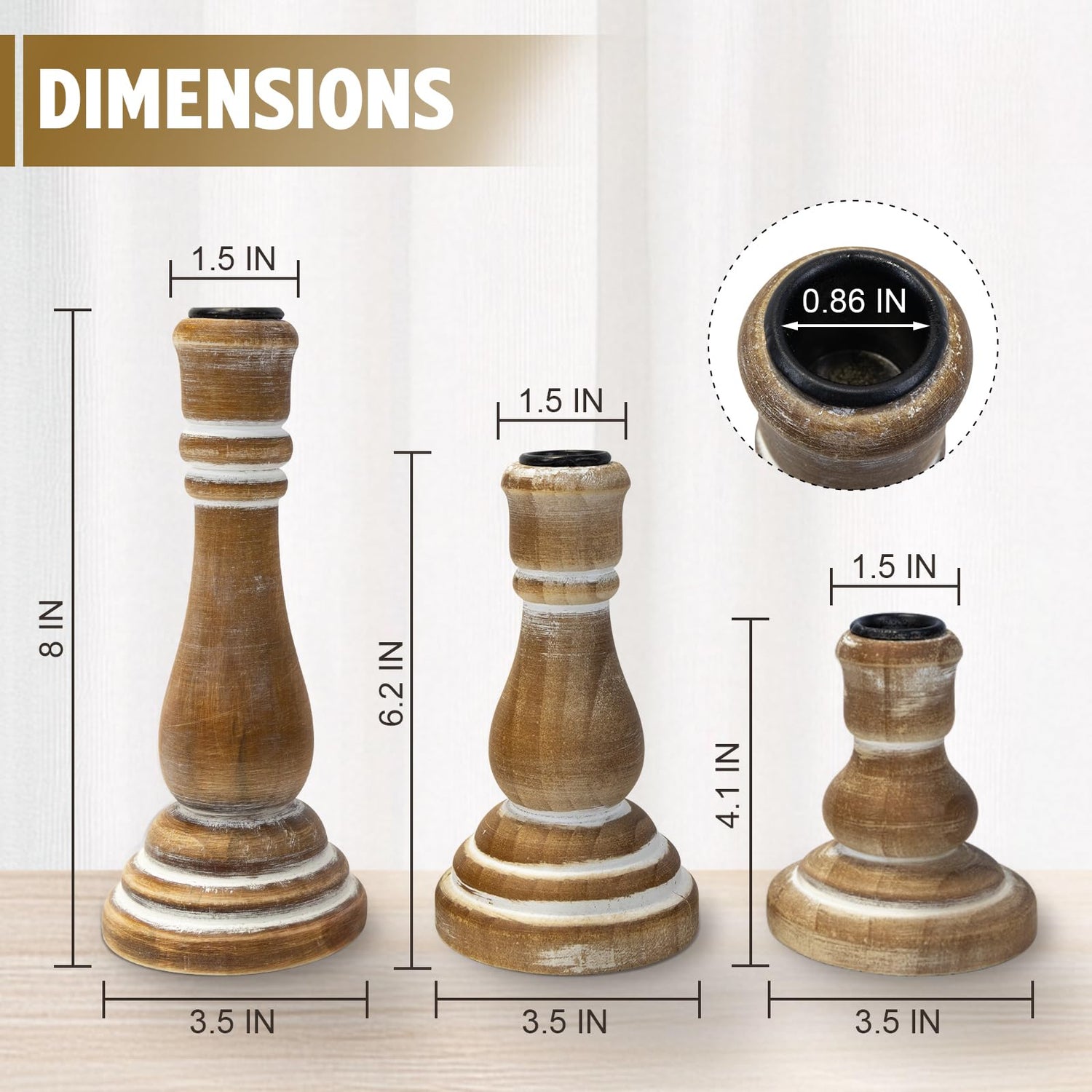- [RUSTIC CANDLE STICK STANDS] The farmhouse candle holder features a vintage unique and exquisite curved design, And the rich white finish design and old-world textures blend for a refined classic elegant taste. Place your favorite taper candle on the candle holder wood and the classic rustic wooden candle holder will become an elegant table decoration.