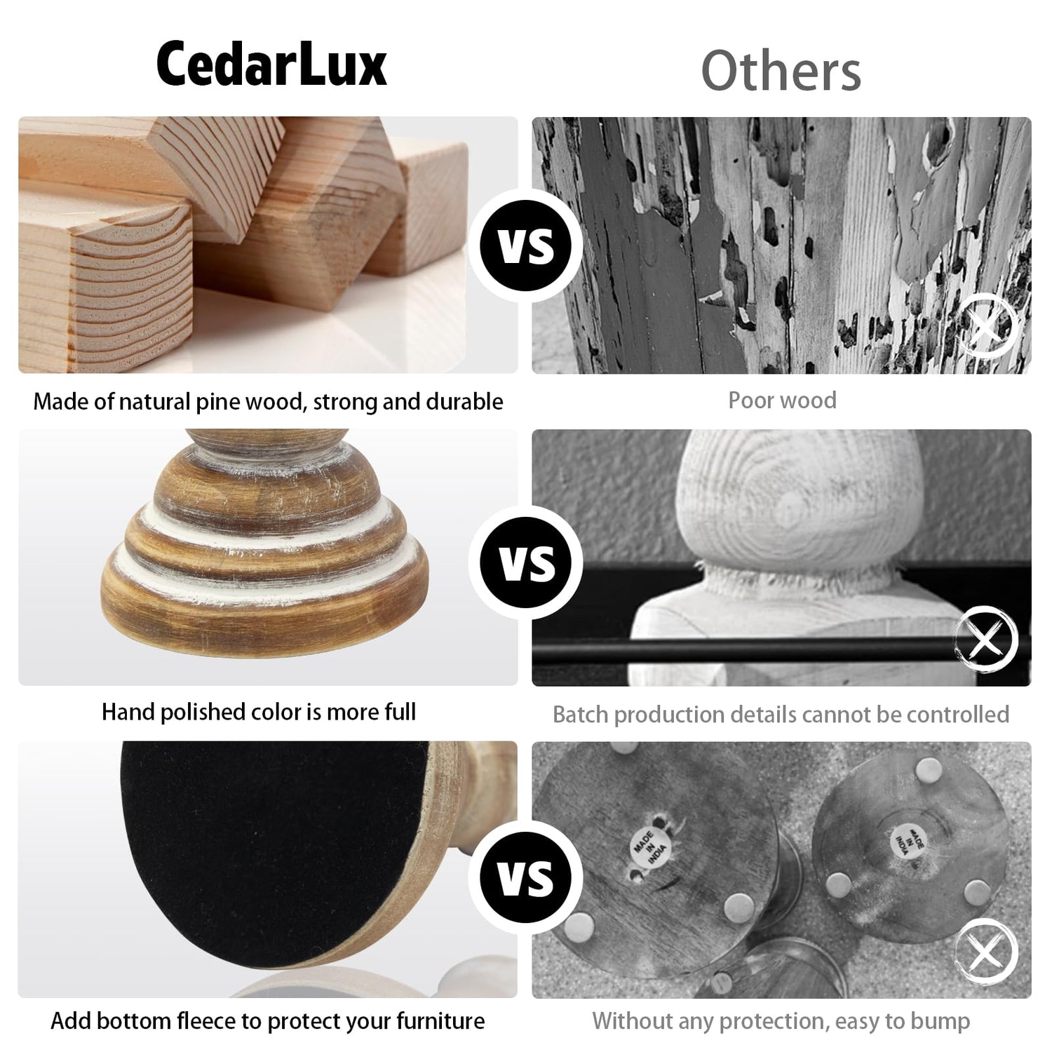 - [STURDY MATERIAL] This wooden candlestick is made of high quality pine wood, which weighs more than normal pine and wood, making the candlestick more stable on the table, and the even weight makes the candlestick move smoothly. The base of the tall candlestick comes with felt to prevent it from sliding or scratching your furniture. Topped with iron wax cups to eliminate fire hazards.