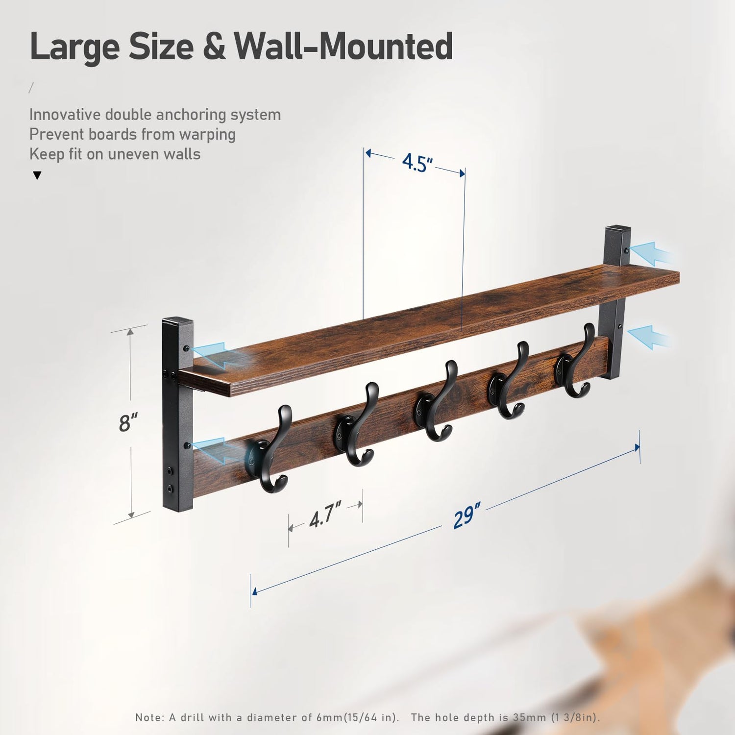 Tatub 29" Rustic Coat Rack Wall Mount with Shelf, Wall Hooks with Shelf, Entryway Floating Shelf with 5 Metal Hooks, Coat Hangers for Entryway, Living Room, Bedroom, Brown Black