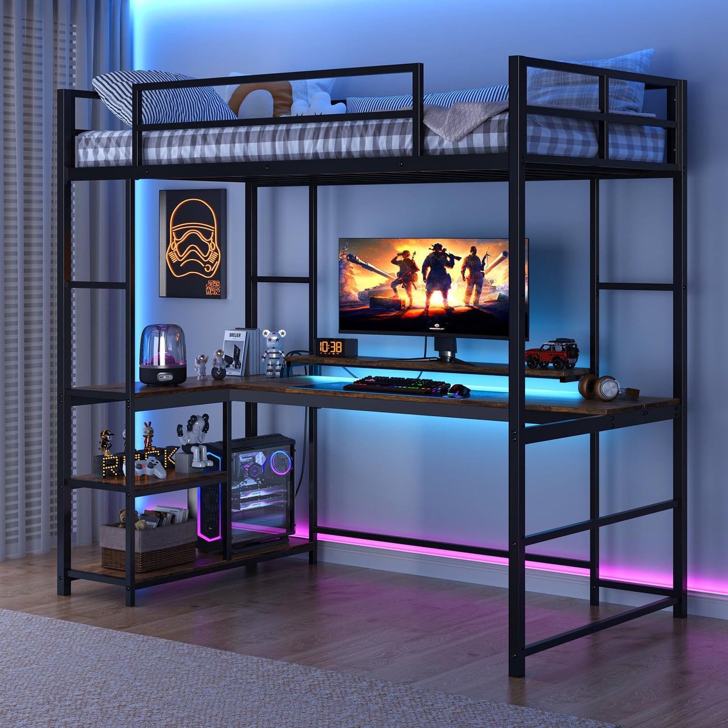 - 【Atmosphere-Enhancing LED Lights】With 60,000+ color options and music sync, the adjustable LED lights on this gamer loft bed for teens are controllable via remote or app, letting you create the perfect esports vibe
