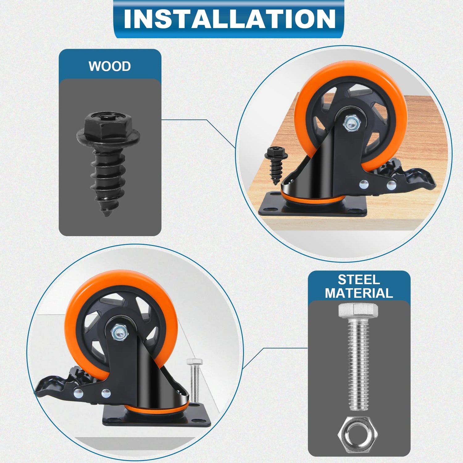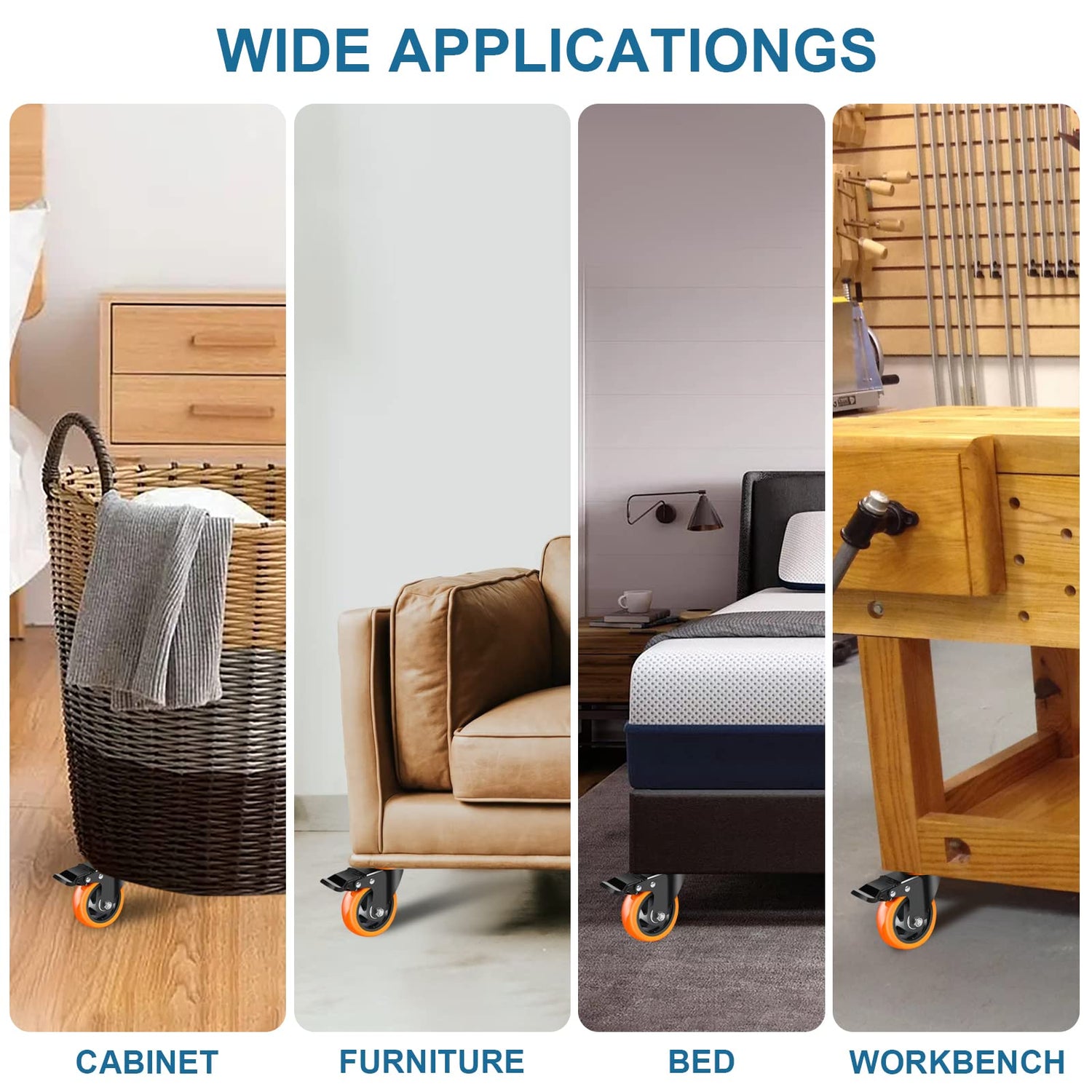 - 【FREE HARDWARE KIT AND TYPICAL APPLICATION】 Castor wheels sets 4 are widely used in workbench, trolleys, furniture, carts, dolly, suitable for indoor and outdoor, it is a mobile expert. We provide two types of screw kits to install our heavy-duty casters onto wood or steel. Includes: 4 swivel casters,Two gloves, One screwdriver, 16 screws, 16 bolts and 16 nuts.