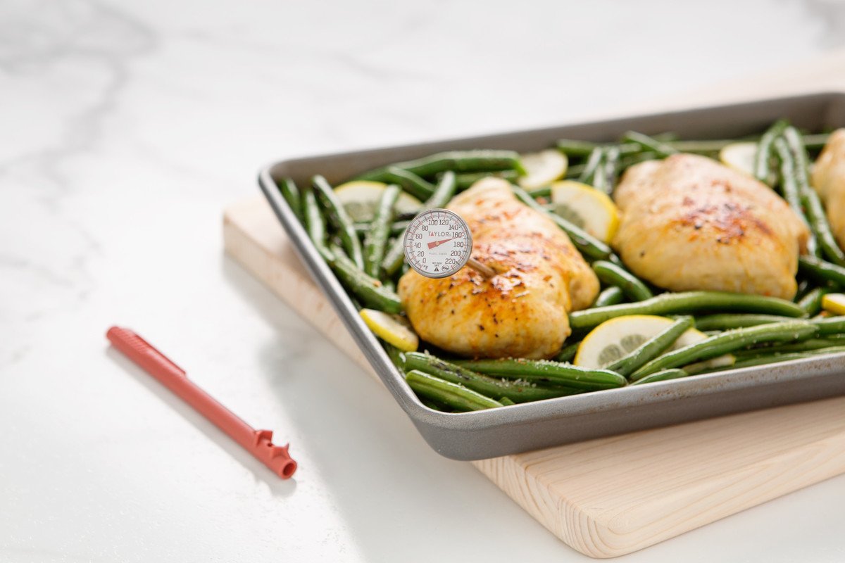 Taylor Instant Read Analog Meat Food Grill BBQ Cooking Kitchen Thermometer with Red Pocket Sleeve for Calibration, 1 inch dial, Stainless Steel