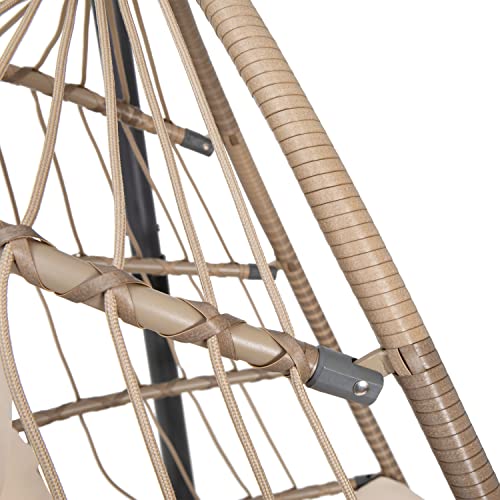 Details: Give your home, deck or patio a trendy upgrade with this beautiful, boho style hanging egg chair. Sure to be a perfect addition to any indoor or outdoor space, this luxuriously comfy chair will become your go-to seat in no time. The included stand is perfect for apartments and condos. Get the hanging chair you want without damaging the ceiling. Durably crafted with polyethylene rattan resin wicker wrapped around an aluminum frame for weather-resistant protection, strength, and durability the swing folds flat for storage or transport. A powder coated C-style heavy duty steel frame is included, as well as a strong spring with S-shaped hooks and an adjustable chain so your swing chair will always be at the right height for any user. The plush seat cushion and headrest pillow are UV resistant for fade protection and lasting use. With easy setup, exceptional style and luxury comfort, this egg chair and stand will upgrade any home.