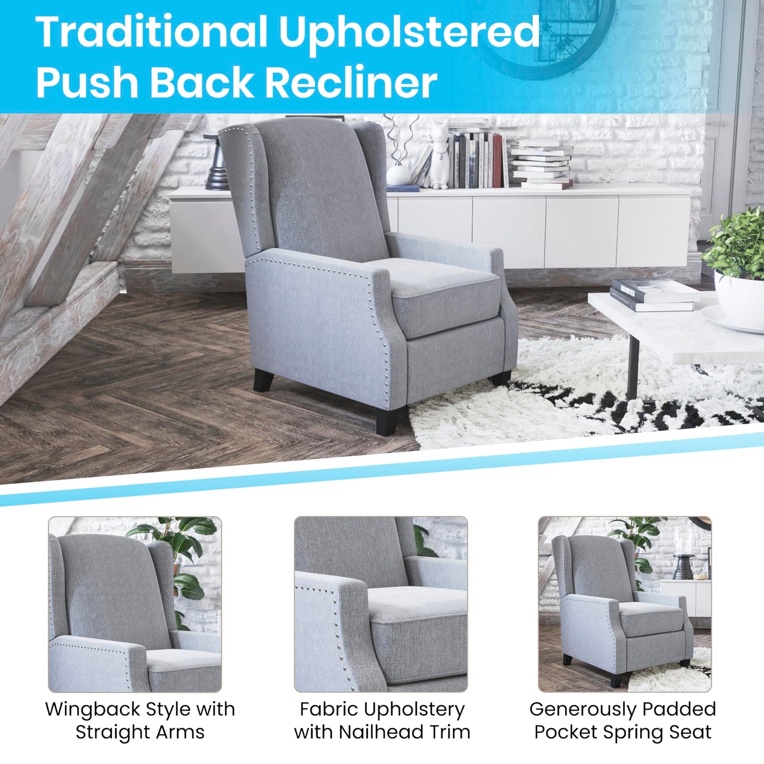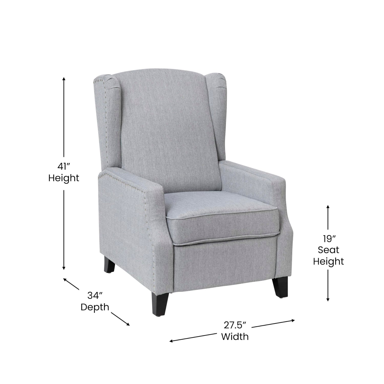 Taylor & Logan Maxfield Traditional Gray Fabric Upholstered Slim Wingback Recliner with Accent Nail Trim and Push Back Recline