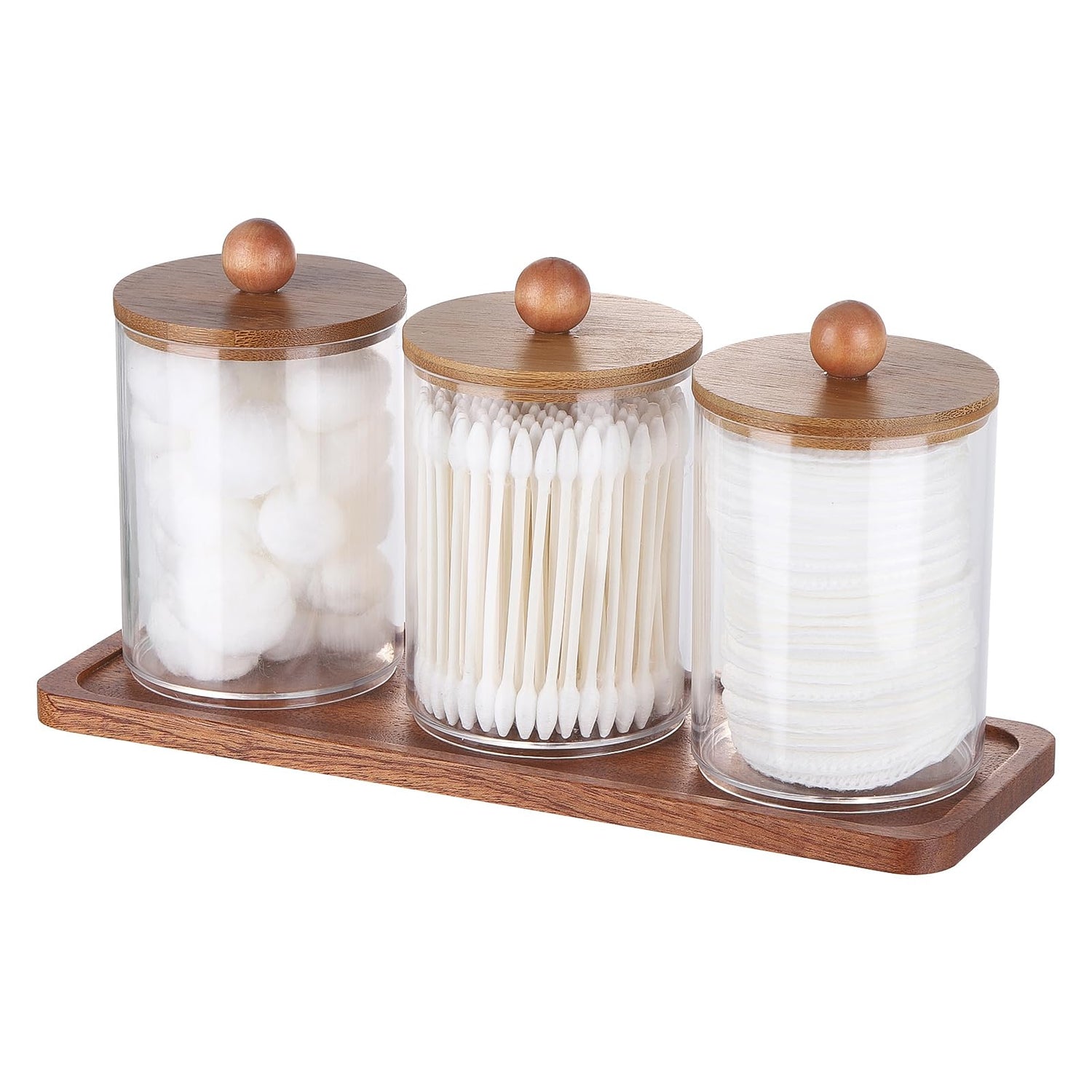 Details: Tbestmax Qtip Holder with Vanity Tray, Clear Bathroom Containers Dispenser for Storage Cotton Swab/Ball/Pad Holder Wood Lids