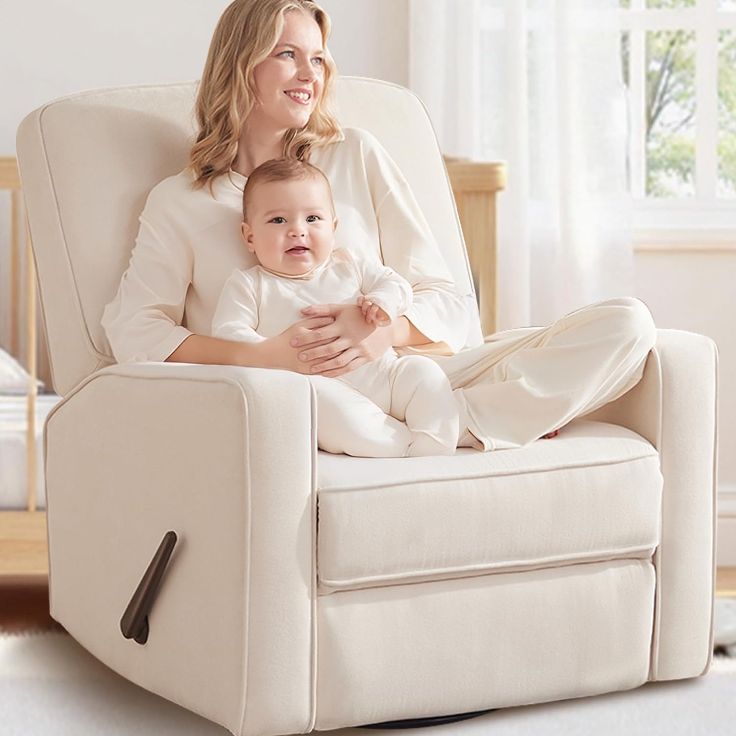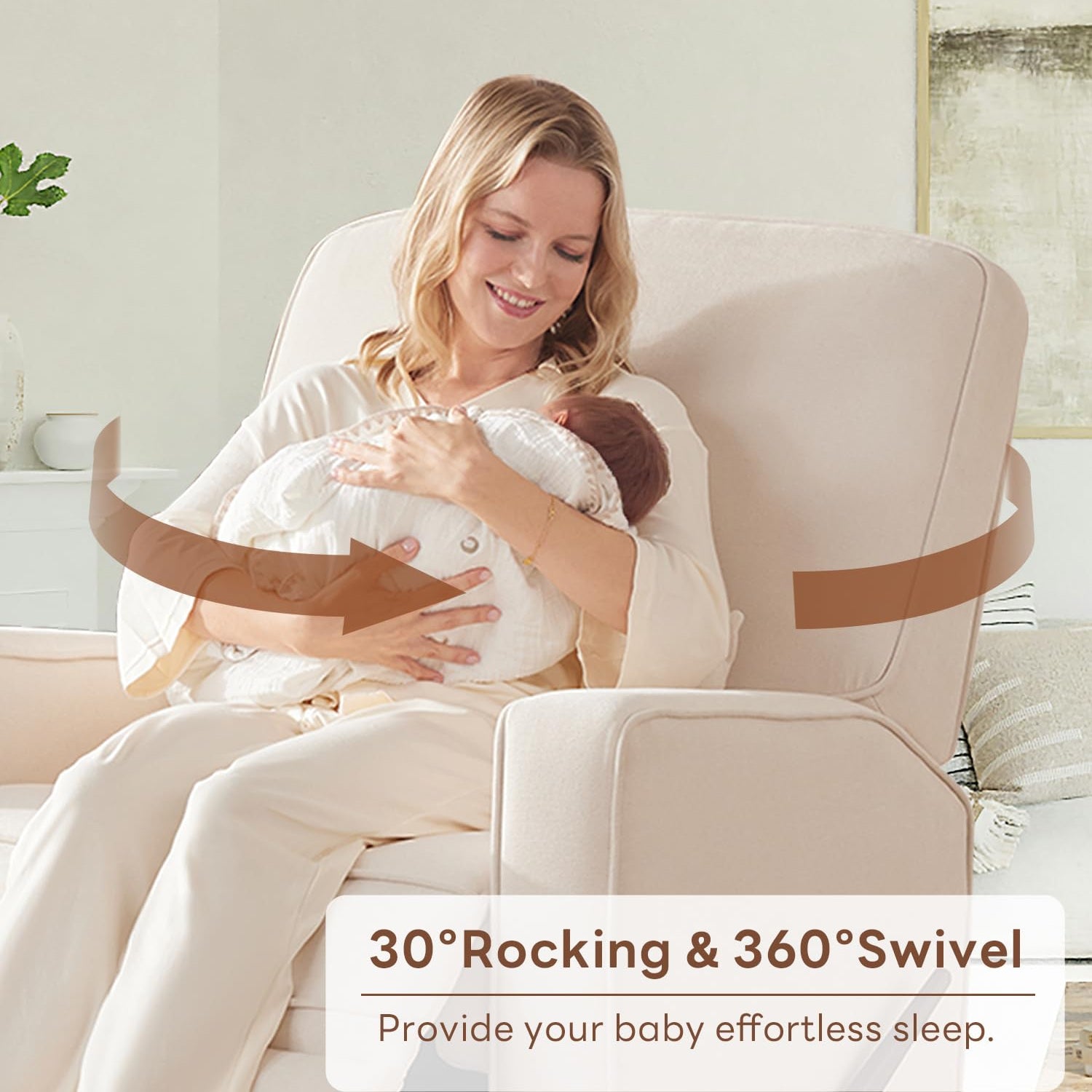 - 【360° Swivel and Smooth Recline Function】Experience effortless movement with 360° smooth rotation and gentle back-and-forth rocking chair motion, perfect for nursing, reading, or relaxing. The high backrest cradles your neck and shoulders, while the included lumbar pillow provides targeted support—ideal for your nursery chair, bedroom chair, or living room chair.