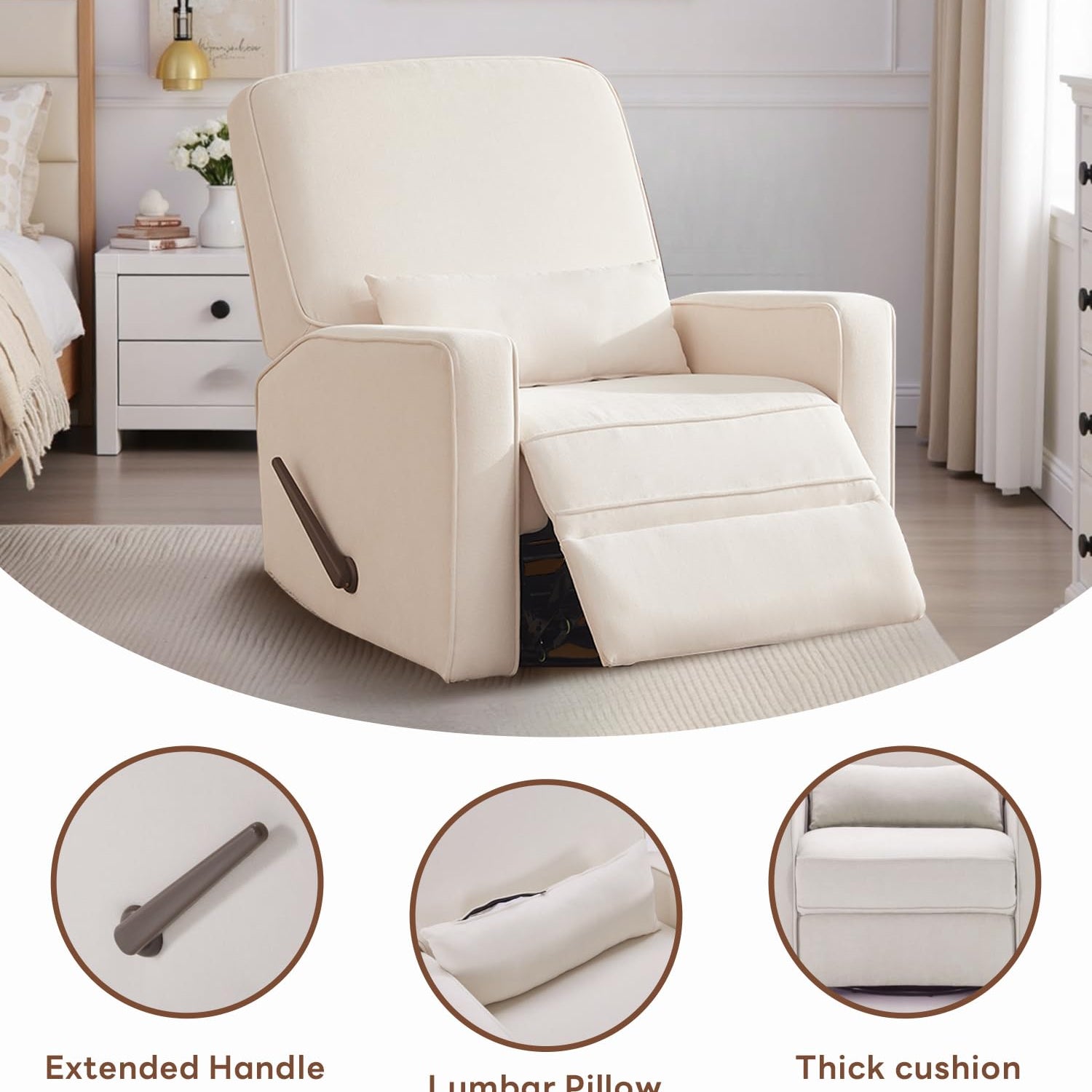 Tbfit 360° Swivel Recliner Chair, Nursery Rocking Chair with Lumbar Support for Bedroom, Comfy Upholstered Armchair with Pillows & Footrest for Living Room, Beige