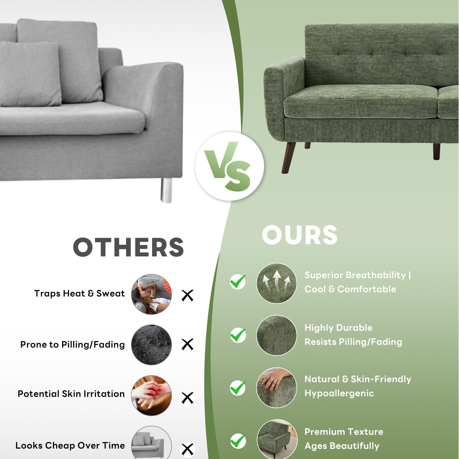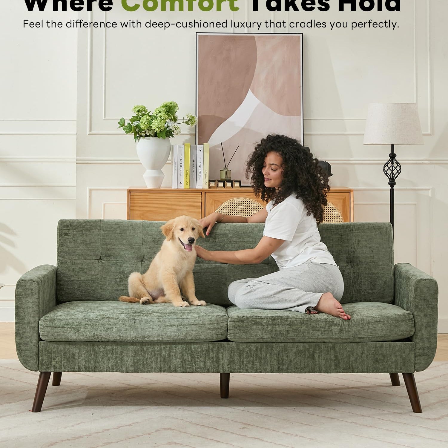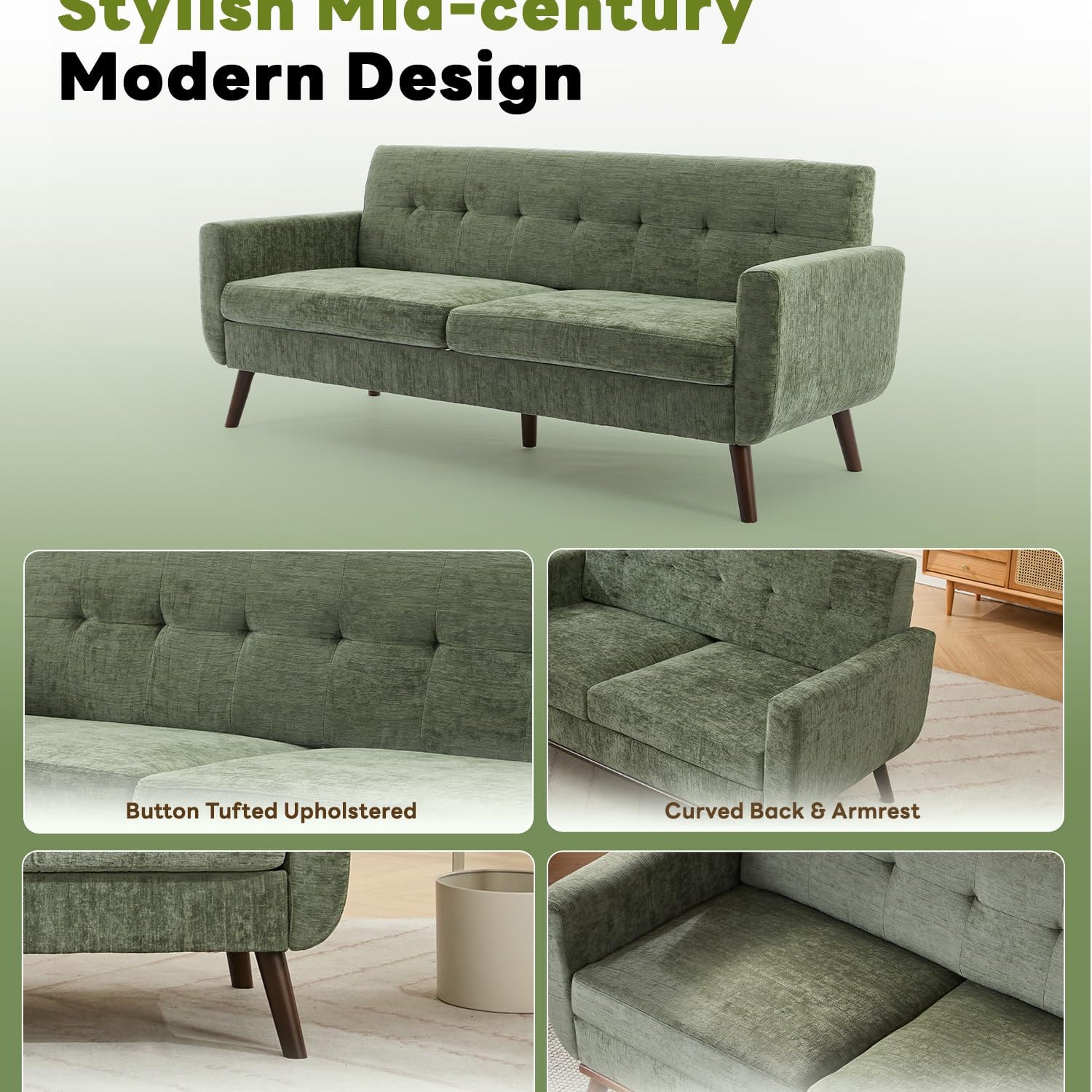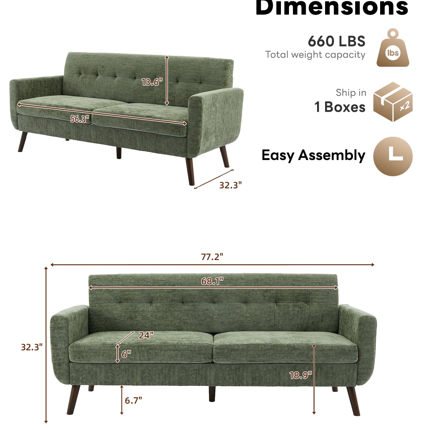 Tbfit 77.2" W Linen Sofa Couch, Mid Century Modern Decor Loveseat Couches for Living Room, Button Tufted Upholstered Small Couch for Bedroom, Solid, and Easy to Install Love Seats Furniture, Green