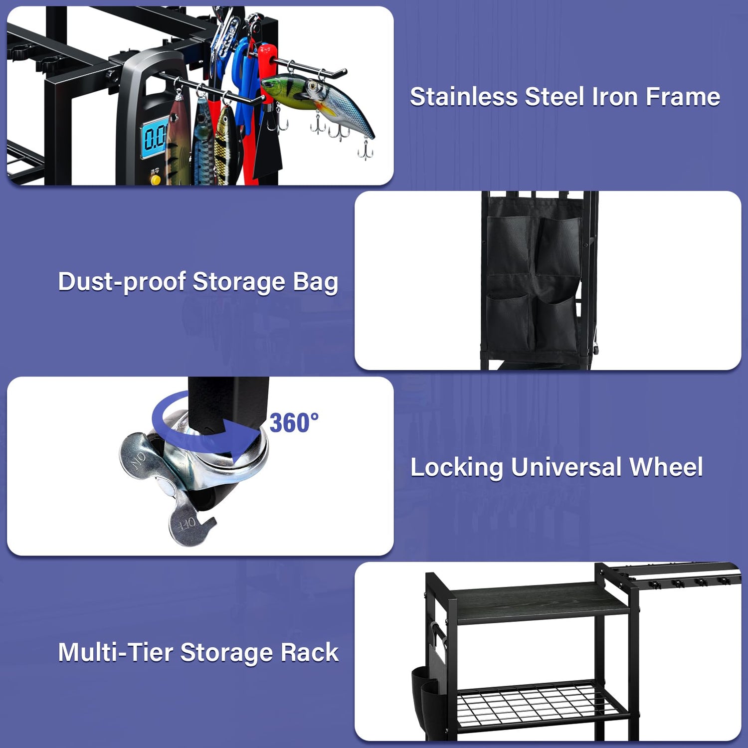- 【Stylish and Practical】Not only is this garage fishing rod storage cart practical, but it also has a simple and elegant design that blends in perfectly with any home decor. It can efficiently help you organize your fishing gear and save valuable space in your home.