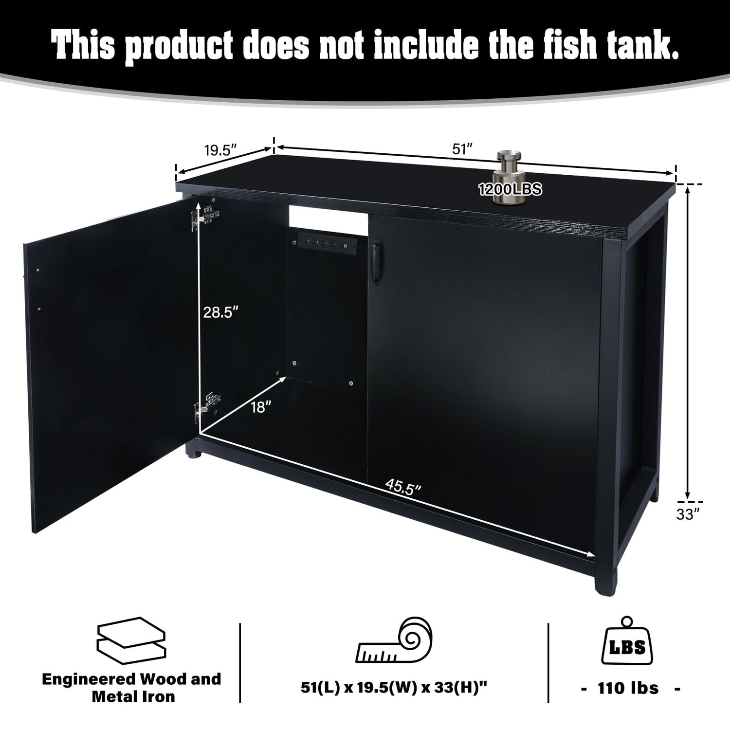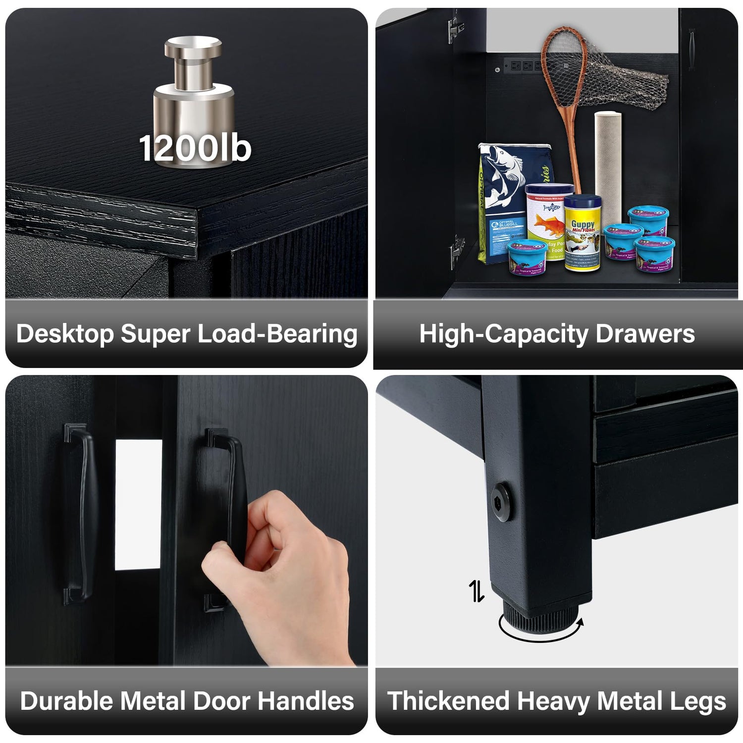 - 1200lb Top Super Load Capacity: Our fish tank cabinet is carefully built to ensure the stability of your fish tank. It is made of a combination of thicker metal iron frame and thicker solid wood boards, with simple, beautiful and sturdy structure. The top of the tabletop can hold up to 1200lbs and the bottom can hold up to 1000lbs. The wood boards are sound-absorbing, soundproof, anti-pollution, anti-aging, safe and odourless