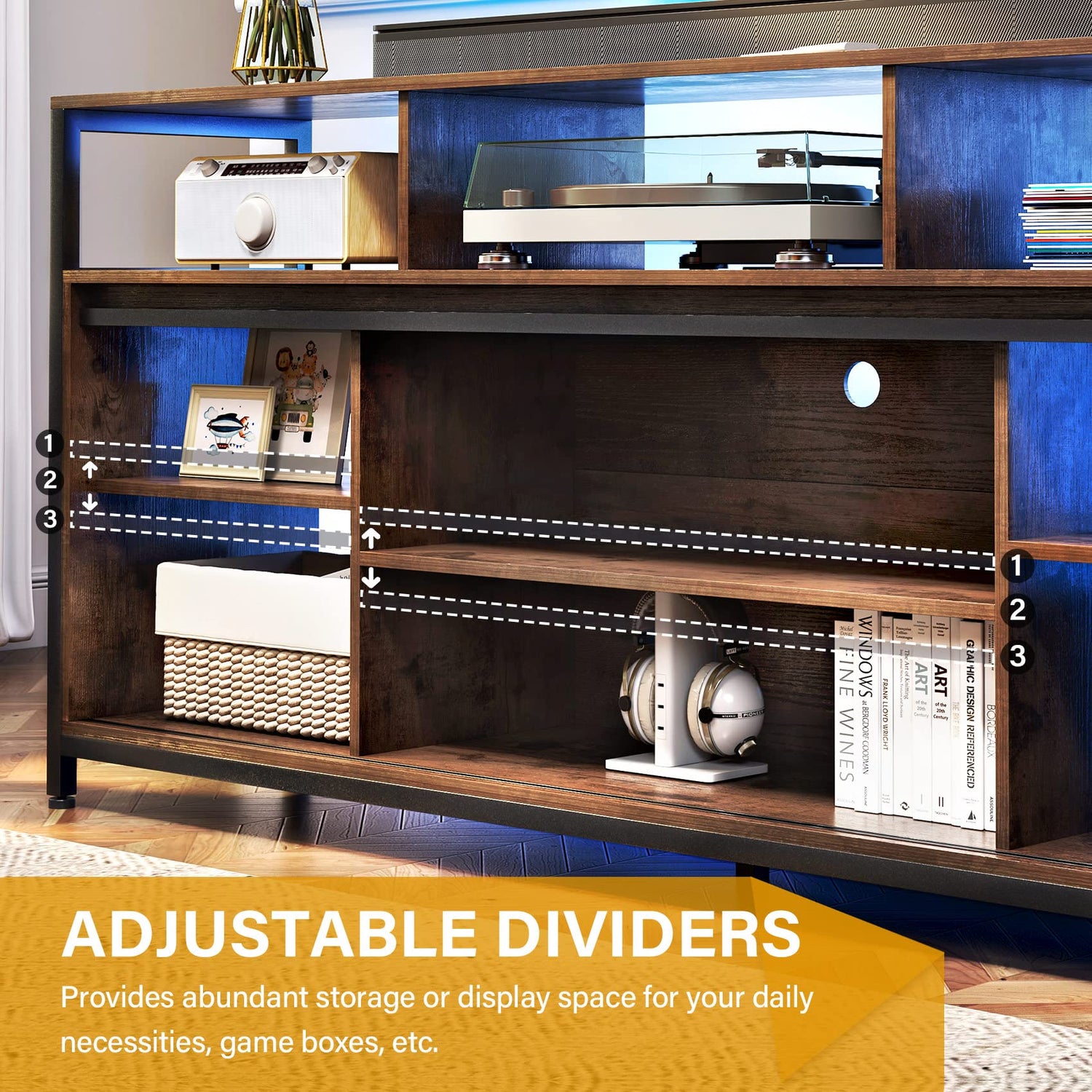 - 【Large Capacity Storage and Adjustable Shelves】The cabinet has 3 large storage spaces, while with adjustable dividers designed to perfectly match various electronic devices or miscellaneous items. The open dividers above the cabinet are perfect for DVDs, game consoles, long stereos and other devices, while giving a higher height.