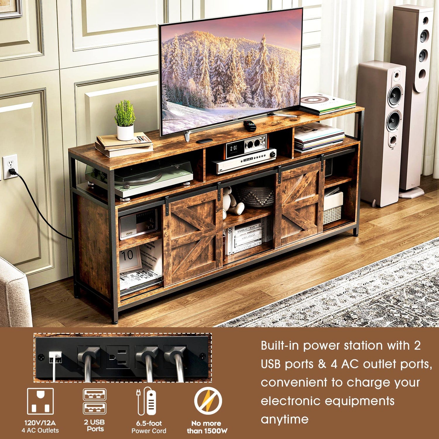 - 【Entertainment Center TV Stand】TC-HOMENY's newly designed 33" high modern TV cabinet is the perfect companion for your home entertainment. It can accommodate a 70 "TV, allowing you to enjoy the visual effects of a large screen. 3-layer storage cabinets, saving space and convenient sorting. Sliding barn doors, metal rails, dust proof, easy to switch. Wire storage hole, avoid clutter, keep clean. Built-in charging station, 4 AC power outlets and 2 USB ports provide plenty of power for your devices. Make your home life more comfortable and convenient!