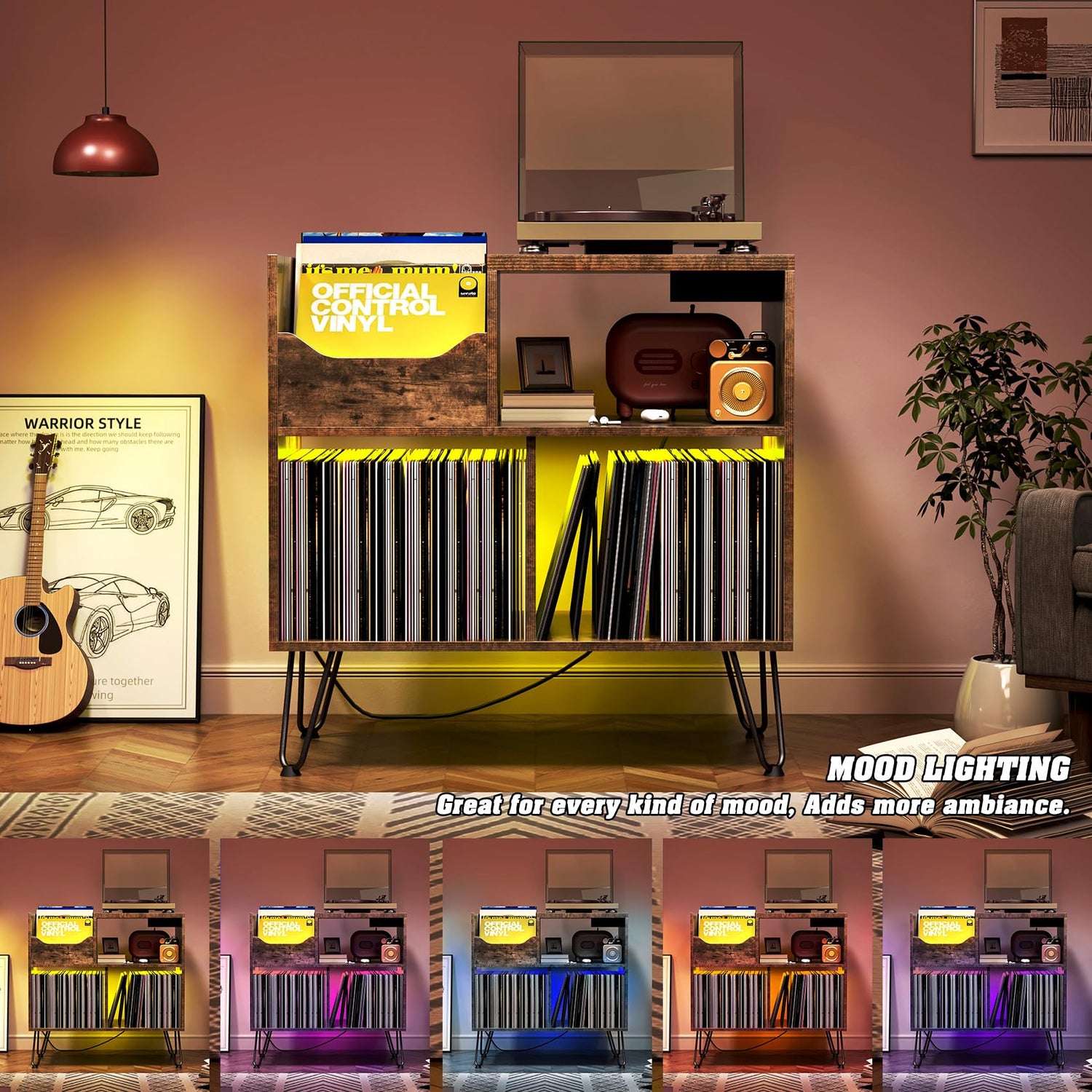 - 【Product Characteristic】The design characteristic of this record player stand are as follows, the first of all is socket with 2 USB ports and 3 standard plug sockets(ETL Certification); the secondly is LED light with remote control, and adjustable ambiance lights in a variety of colors; the last one is hairpin legs, four sturdy hairpin legs, it is fashionable and beautiful.