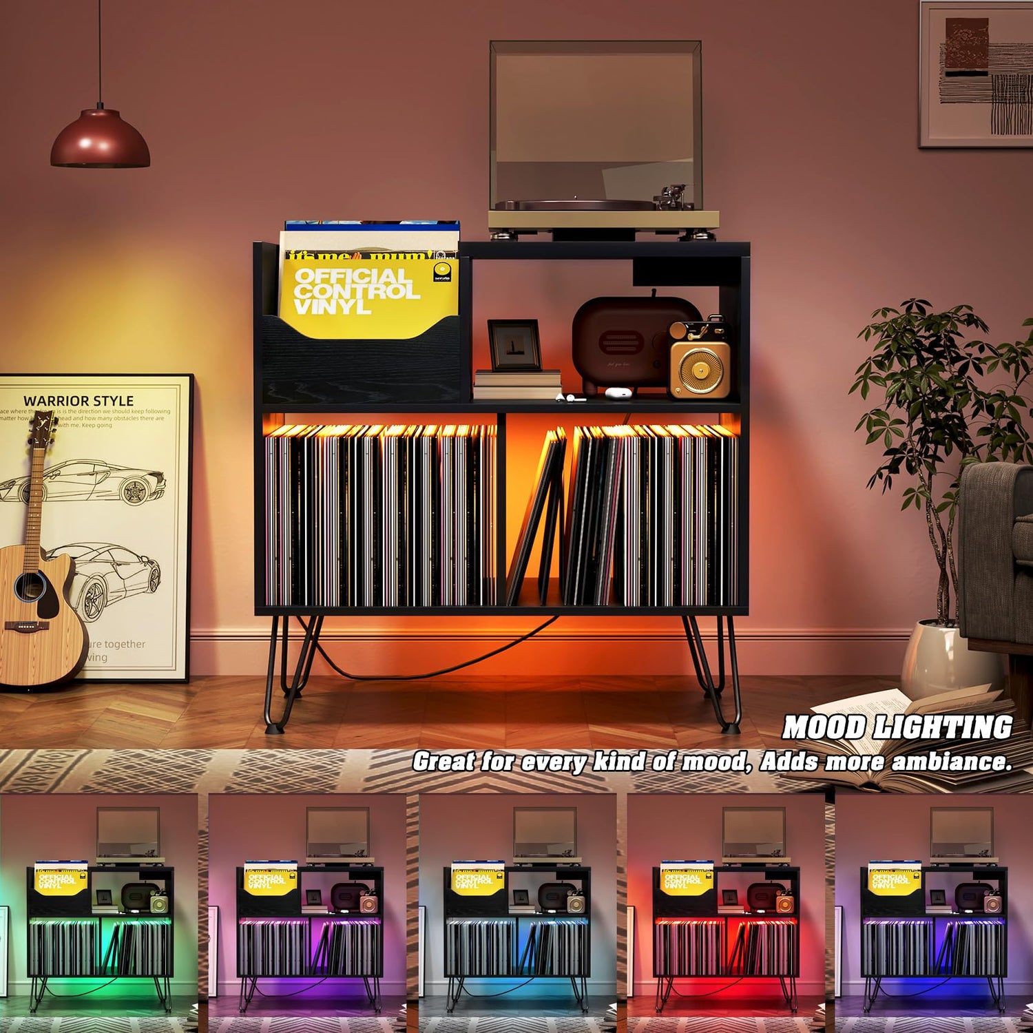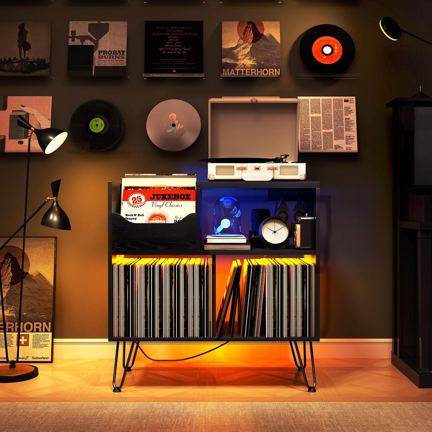 - ♬【Product Characteristic】The design characteristic of this record player stand are as follows, the first of all is socket with 2 USB ports and 3 standard plug sockets(ETL Certification); the secondly is LED light with remote control, and adjustable ambiance lights in a variety of colors; the last one is hairpin legs, four sturdy hairpin legs, it is fashionable and beautiful.