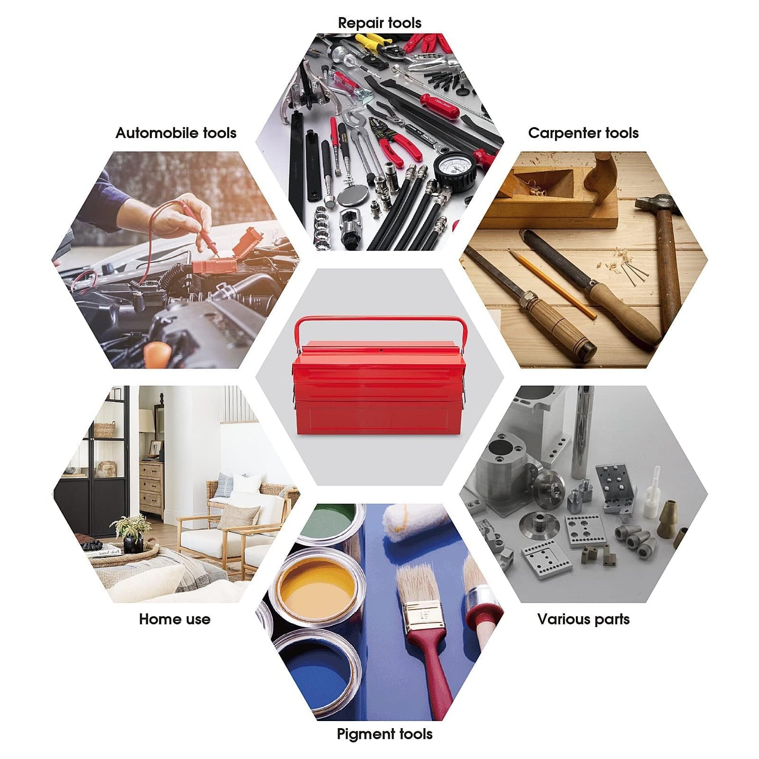 Details: HIGH QUALITY MATERIALS: The metal tool box is made of sturdy and thickened steel, which is strong and durable, not easy to bend and deform, and has a long service life with a dimension of 17.7 x 7.87 x 8.2 inches. HIGH CAPACITY: This steel tool box has 3 tiers and 5 trays for easy access to tools and parts. The small trays hold small parts such as wrenches, pliers, etc., and the large trays keep larger tools well organized. EASY TO CARRY. This metal tool box comes with an elongated handle with a curled design that protects your hands well and provides a comfortable, ergonomic grip that makes it easy to carry around. HIGH DURABILITY: The steel tool box is coated with a red powder coating that protects it from scratches and chemical corrosion, making it durable and easy to clean.NO ASSEMBLY REQUIRED: This steel tool box is assembled before shipment, you can just take it out of the package when you receive it and use it directly without assembly. WIDE APPLICATION. The portable design and high functionality of this iron toolbox make it suitable for different scenarios, such as repair stores, garages, medical kits and more.