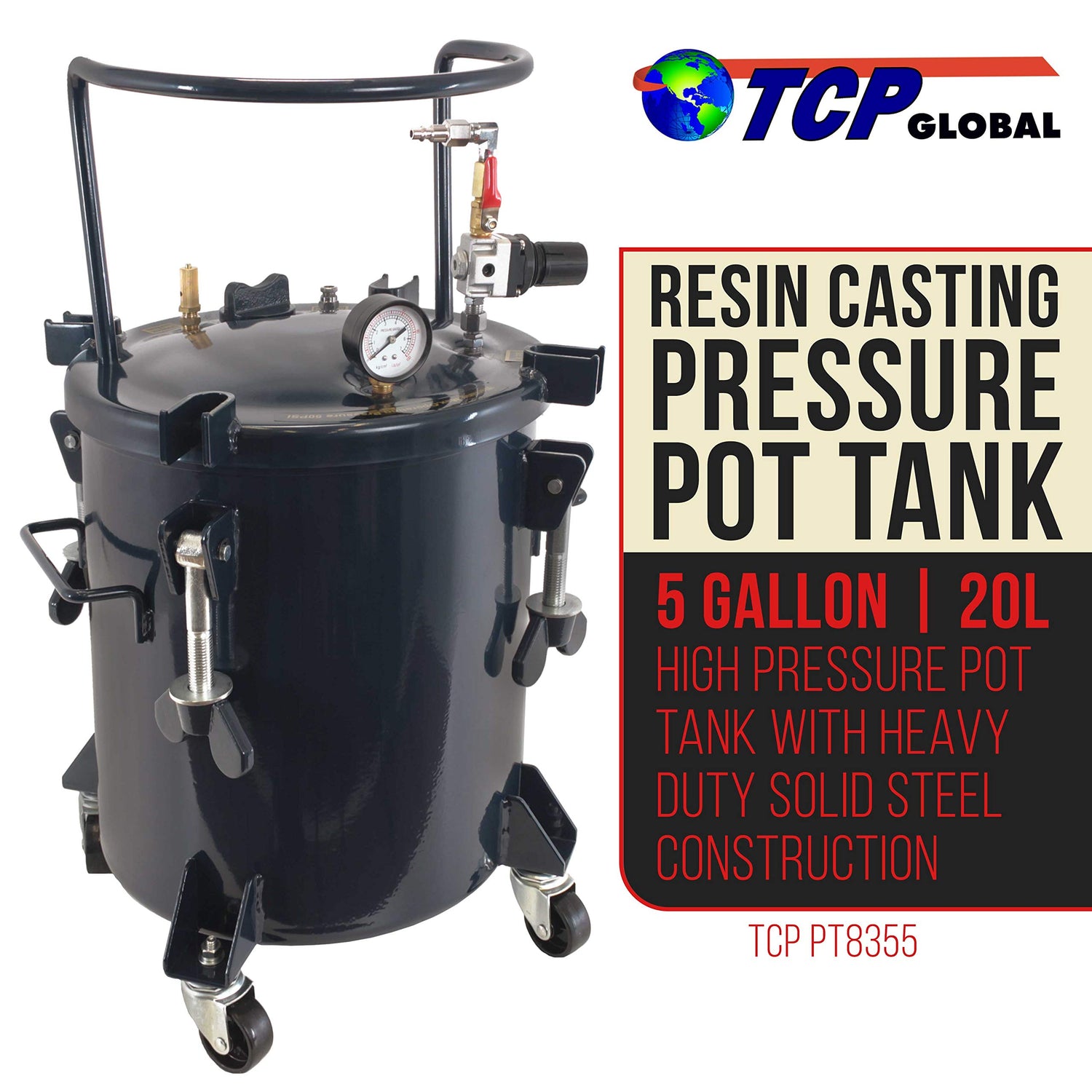 TCP Global 5 Gallon (20 Liters) Pressure Pot Tank for Resin Casting - Heavy Duty Powder Coated Pot with Air Tight Clamp On Lid, Caster Wheels, Regulator, Gauge - Use for Curing Resin in Casting Molds