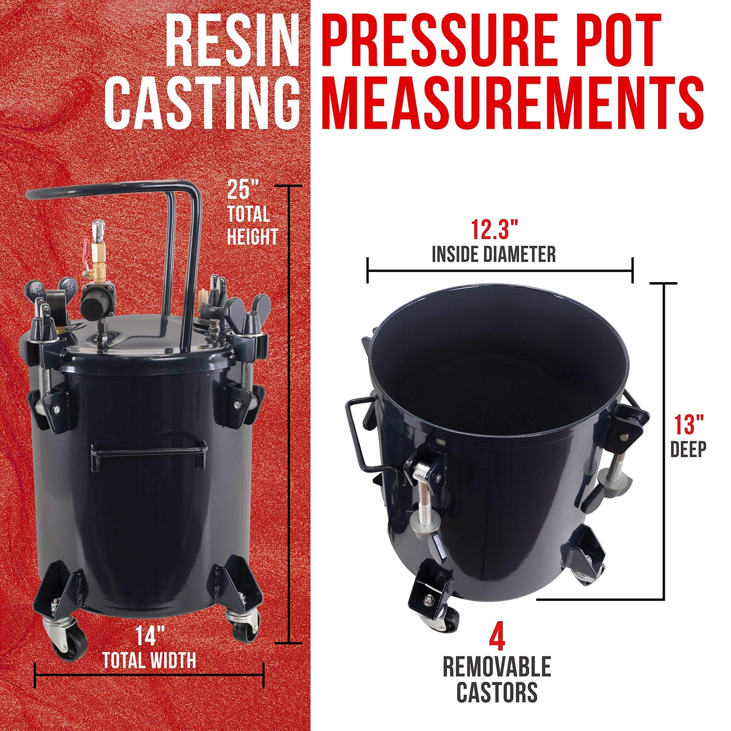 - The pressure pot tank is constructed with heavy gauge steel and has a durable easy to clean powder coating. It has a 12.3" inside diameter and is 13" deep, so it has a large enough capacity to accommodate almost any casting project. Includes 4 removable caster wheels.