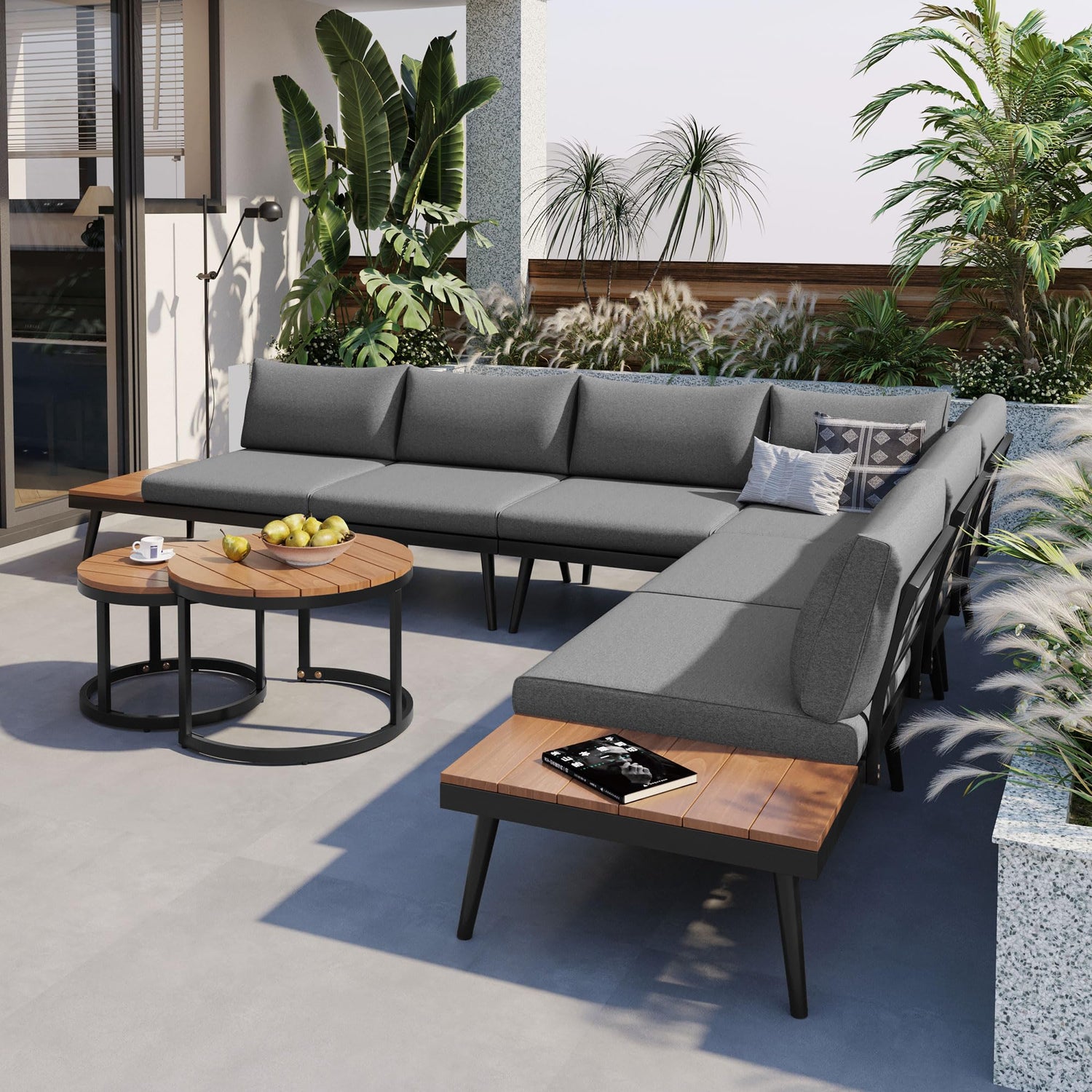 - 【Charming Modern Style】-Soft sofa set and a sophisticated wooden coffee table add a functional and stylish element to your patio. The color of acacia wood is paired with gray or beige upholstery. The striped wooden table top also brings a natural and rustic feel. This modern patio sectional sofa set creates a strong summer atmosphere.