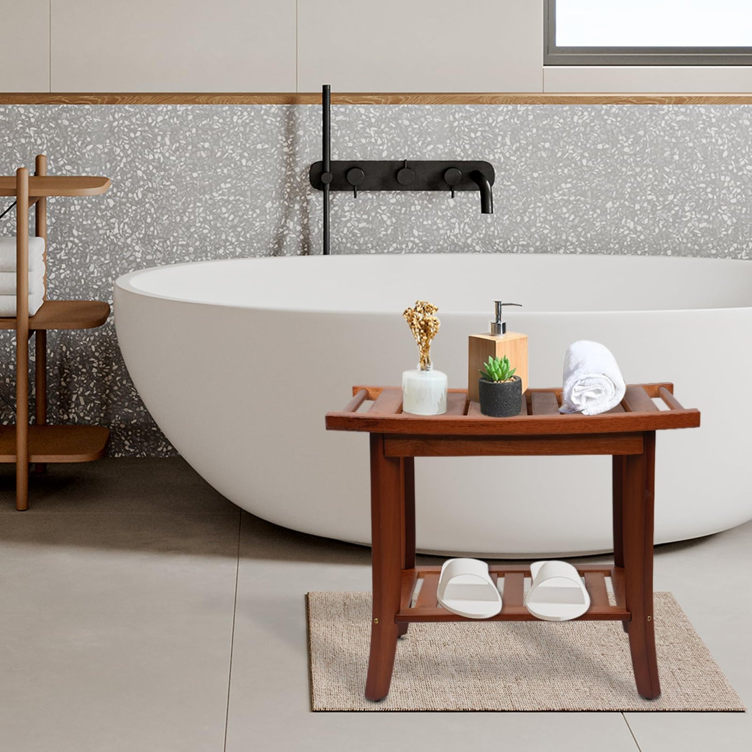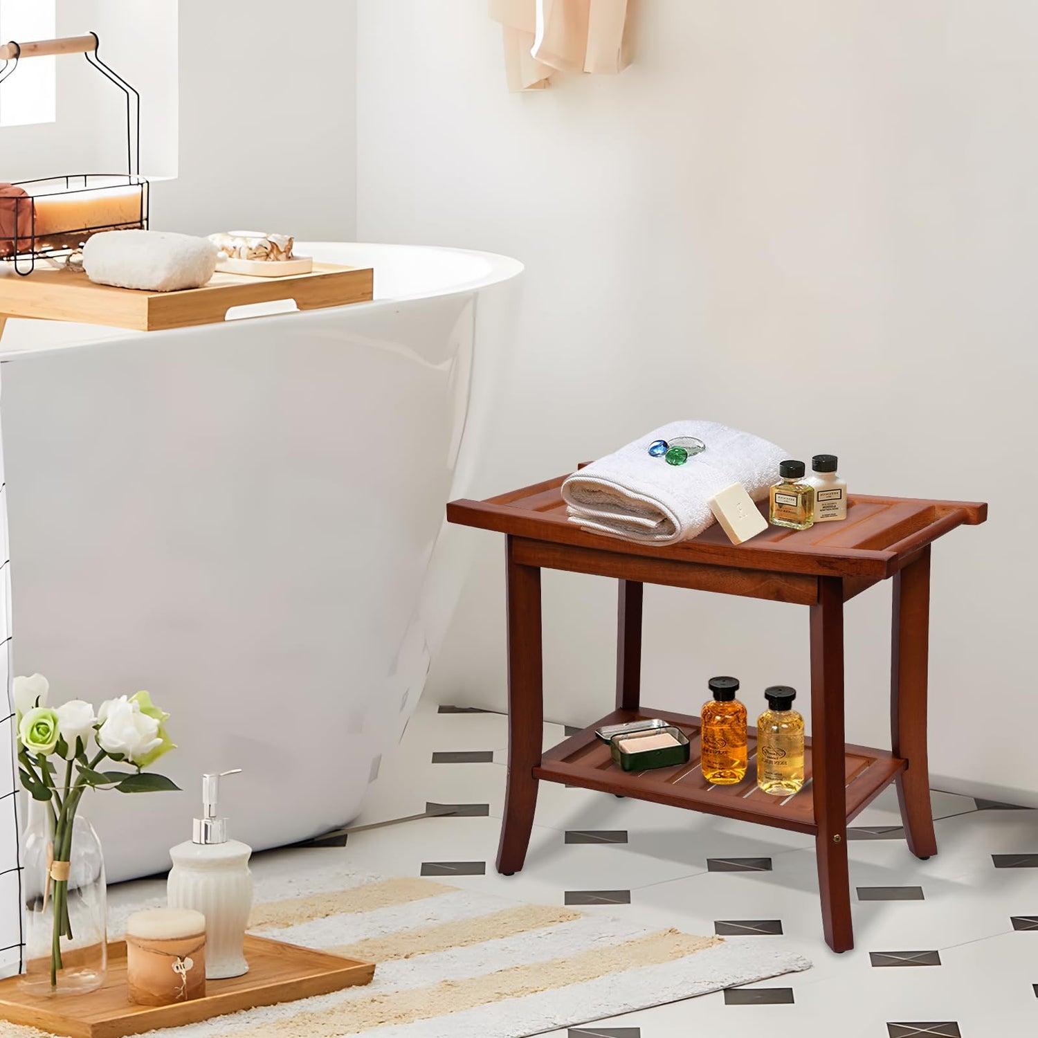 Teak Shower Bench,22'' Solid Wood Shower Stool with Storage Shelf & Handle,Waterproof Shower Bench Seat for Bathroom, Indoor & Outdoor Use