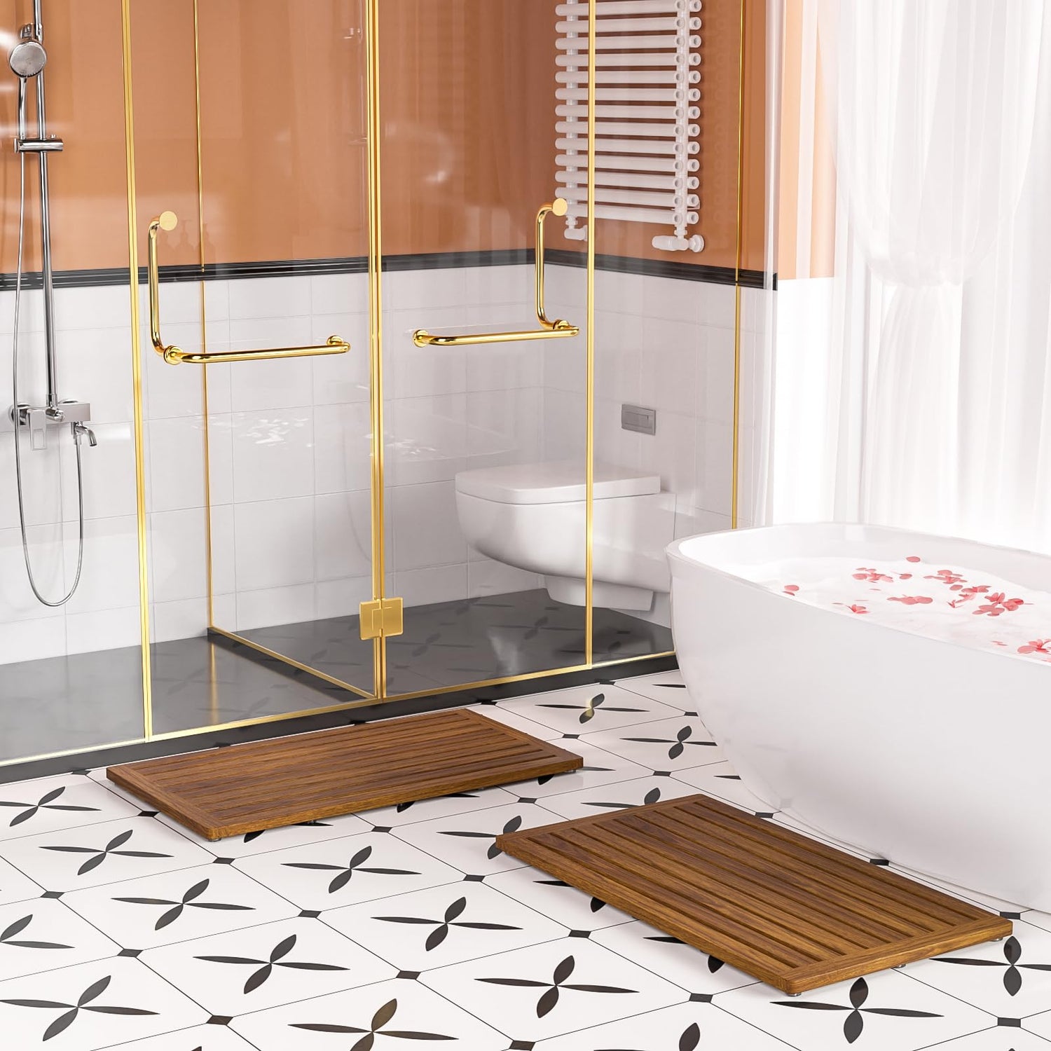 - EXCELLENT MATERIAL: Bathroom mat is made of teak wood,beautiful and elegant.Teak wood material is not as prone to destroyed as traditional bamboo material. Our mats for bathroom is sturdy,and can be used with confidence. Wooden floor mat improves your quality of life