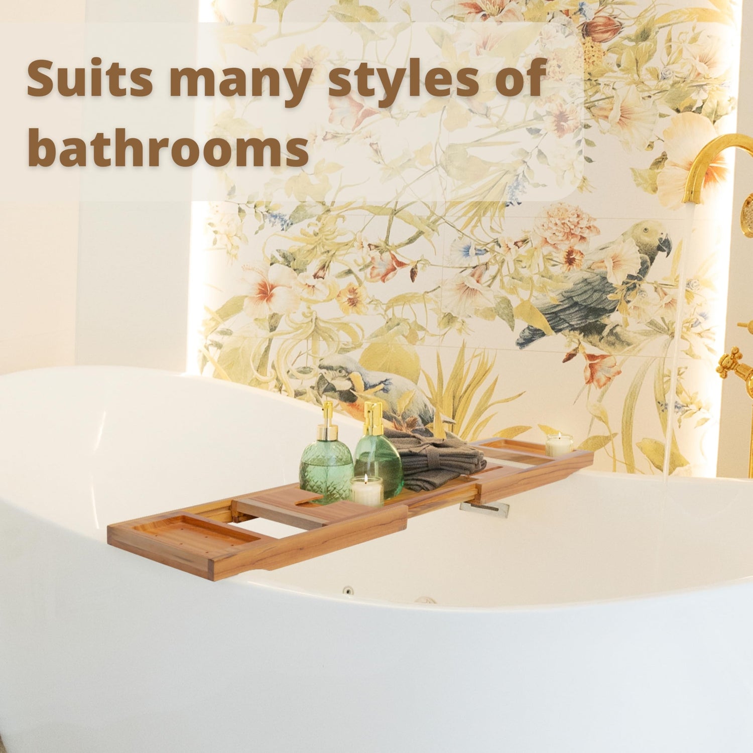 • Expandable Size for Most Bathtubs: Our adjustable bath tray for tub extends from 27.6 inches to 41.3 inches, making it suitable for most bathtubs. This adjustability eliminates the need for multiple measurements, allowing you to quickly and easily enjoy your bubble bath.