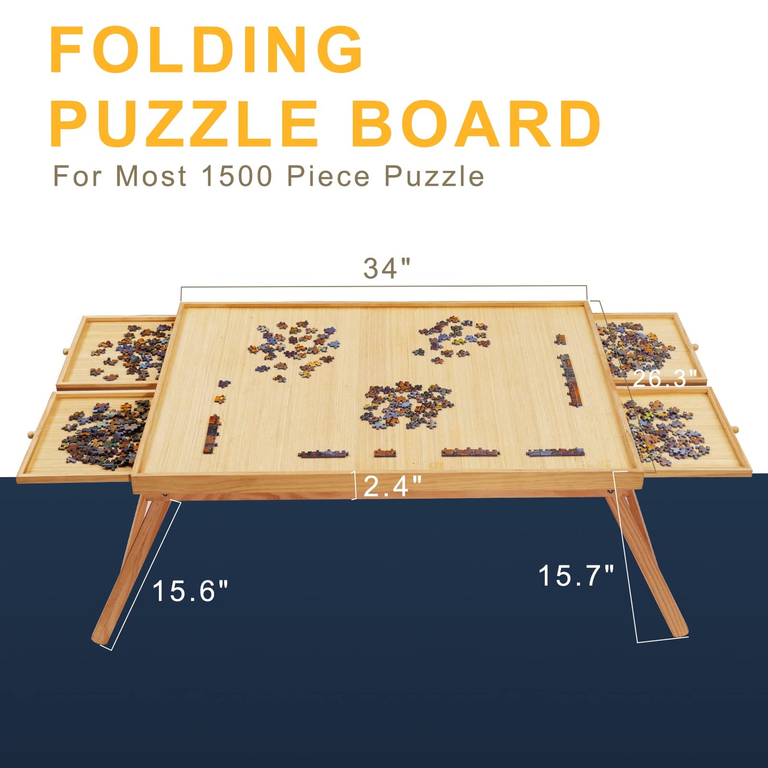 TEAKMAMA 1500 Piece Wooden Jigsaw Folding Puzzle Board, Puzzle Table with Legs and Protective Cover, 34” X 26.3” Jigsaw Puzzle Board with 4 Drawers & Cover, Portable Puzzle Tables for Adults - Natural