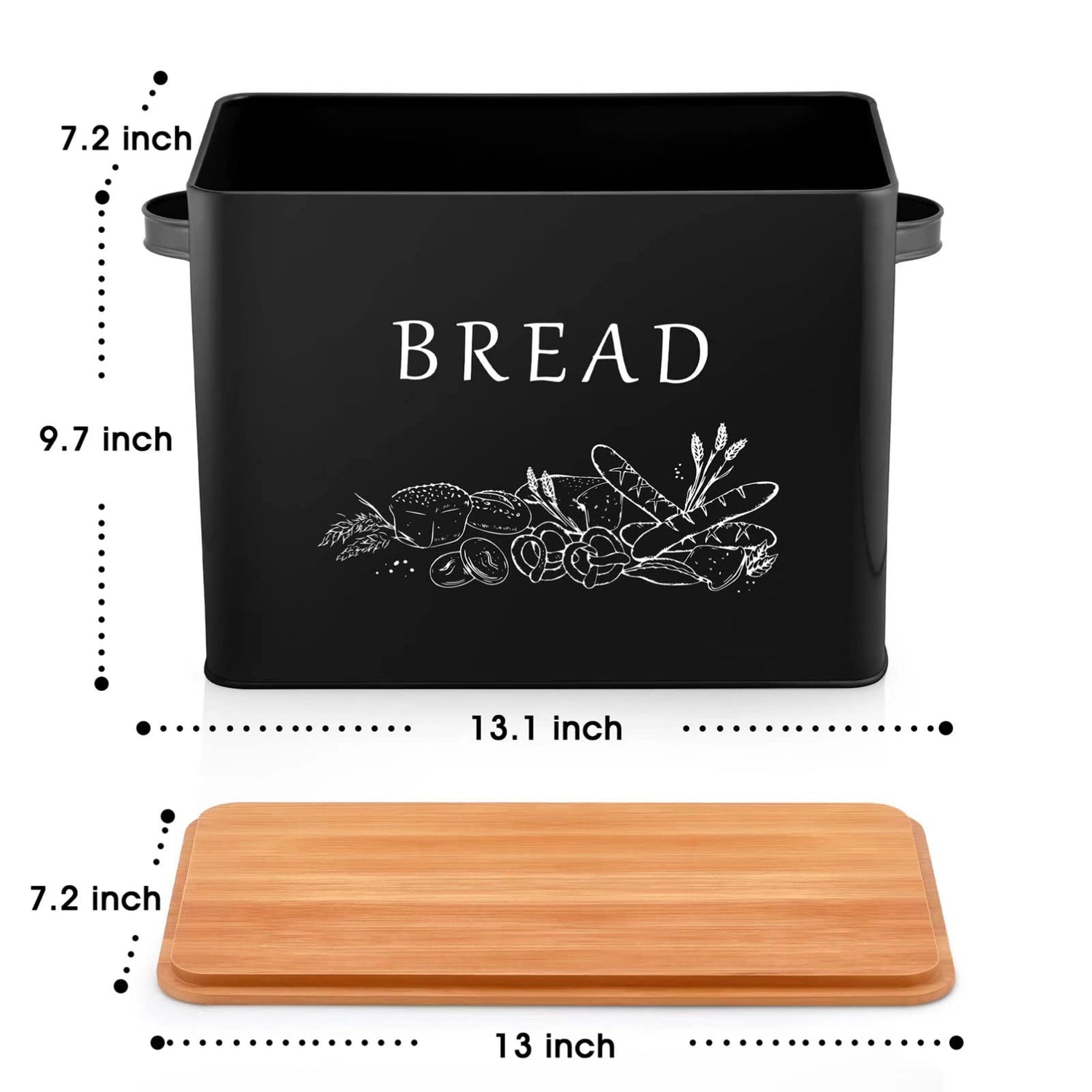 - HEALTHY & LONG-LASTING MATERIAL: The bread container is made of sturdy metal with black rust proof coating and the lid is made of food safe wood, Will not harm you and your families’ health, More sturdy than other material without breaking