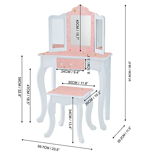 Teamson Kids Princess Gisele Twinkle Star Print 2-Piece Kids Wooden Play Vanity Set with Vanity Table, Tri-Fold Mirror, Storage Drawer, and Matching