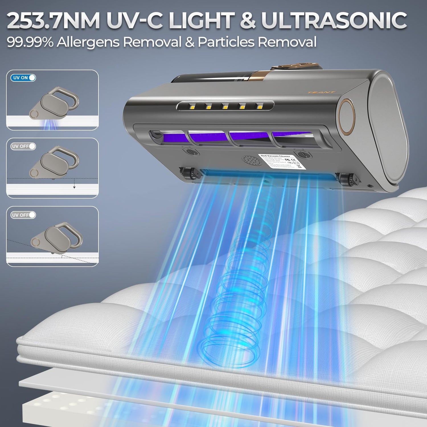 - 【Allergen Removal & Safety】253.7nm UV-C light can effectively remove allergens hidden in the mattress, sofa, carpet and other fabrics in your home. Also, for your safety Teant bed vacuum cleaner is equipped with an internal UV-C Light Leakage Prevention Device. Only when the two gravity sensor wheels at the bottom of the vacuum cleaner are fully pressed down, will the UV-C light work properly!