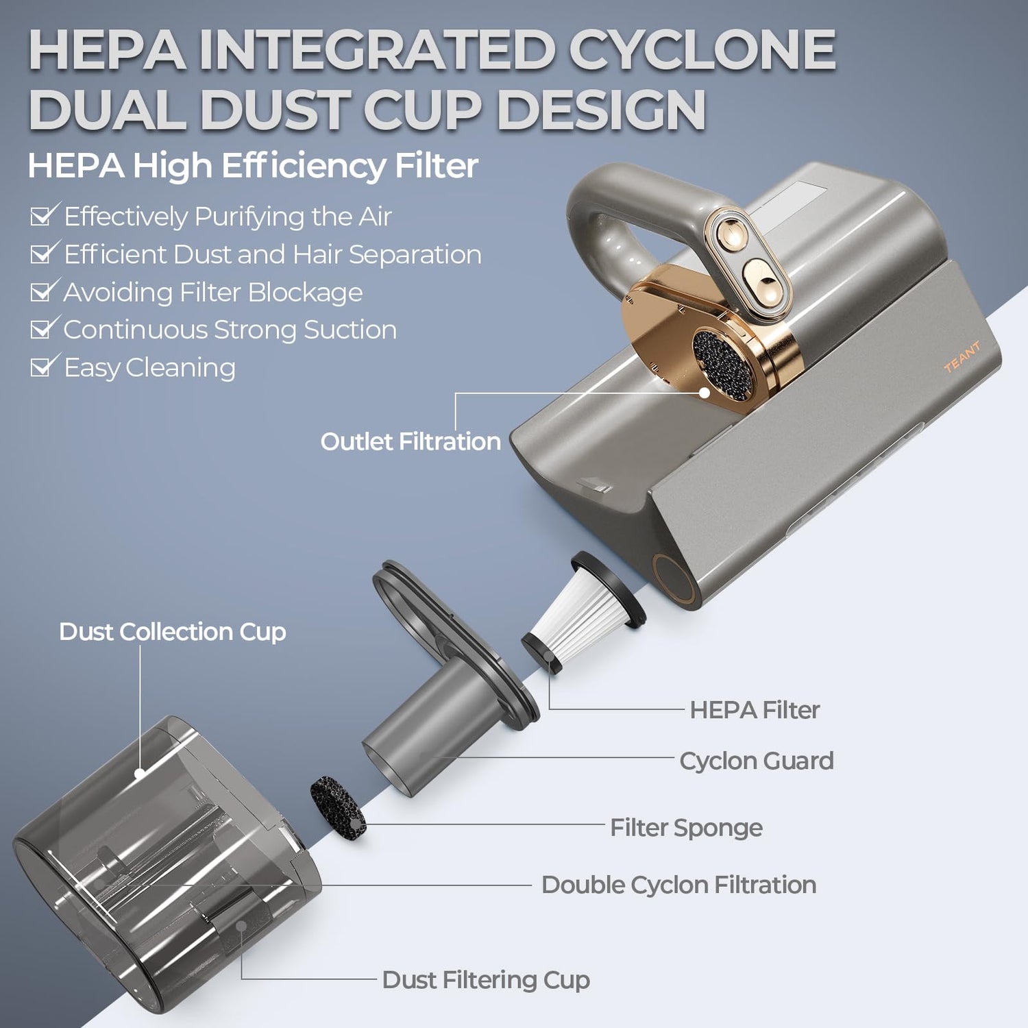 - 【Five-pronged Technology】 Teant mattress cleaner is equipped with an integrated cyclonic dual dust cup design, which effectively separates hair and dust, avoiding clogging and easy to clean; HEPA filter that filters 99.97% of tiny particles (0.3 micron), 140°F hot air, ultrasonic, and UV-C light five-pronged technology enhancing cleaning performance.