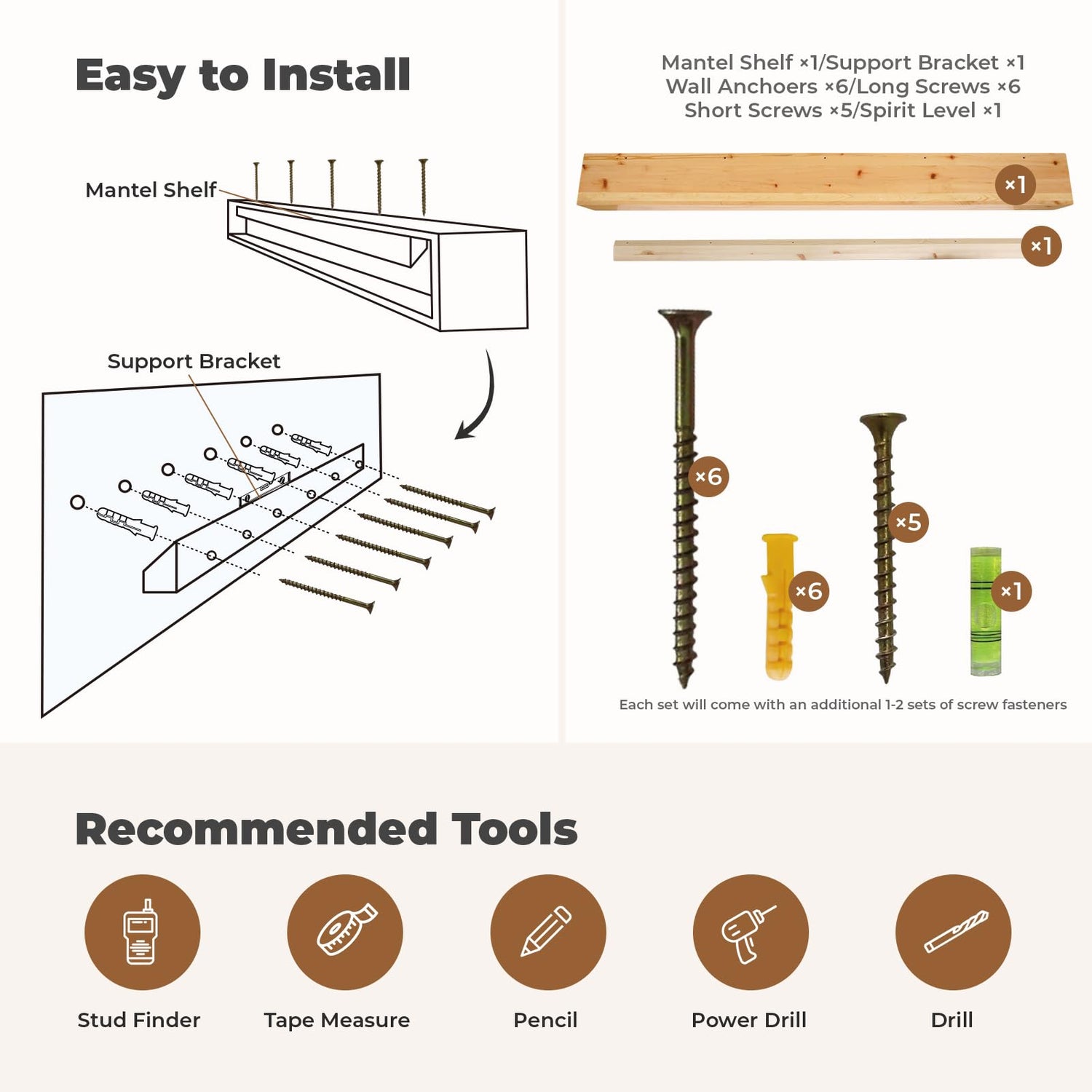 • Hassle-Free Installation: Installing this fireplace mantel is a breeze! Each package includes everything you need: support bracket, wall anchors, long and short screws, and a spirit level. Just grab a tape measure, pencil, and drill for a quick setup