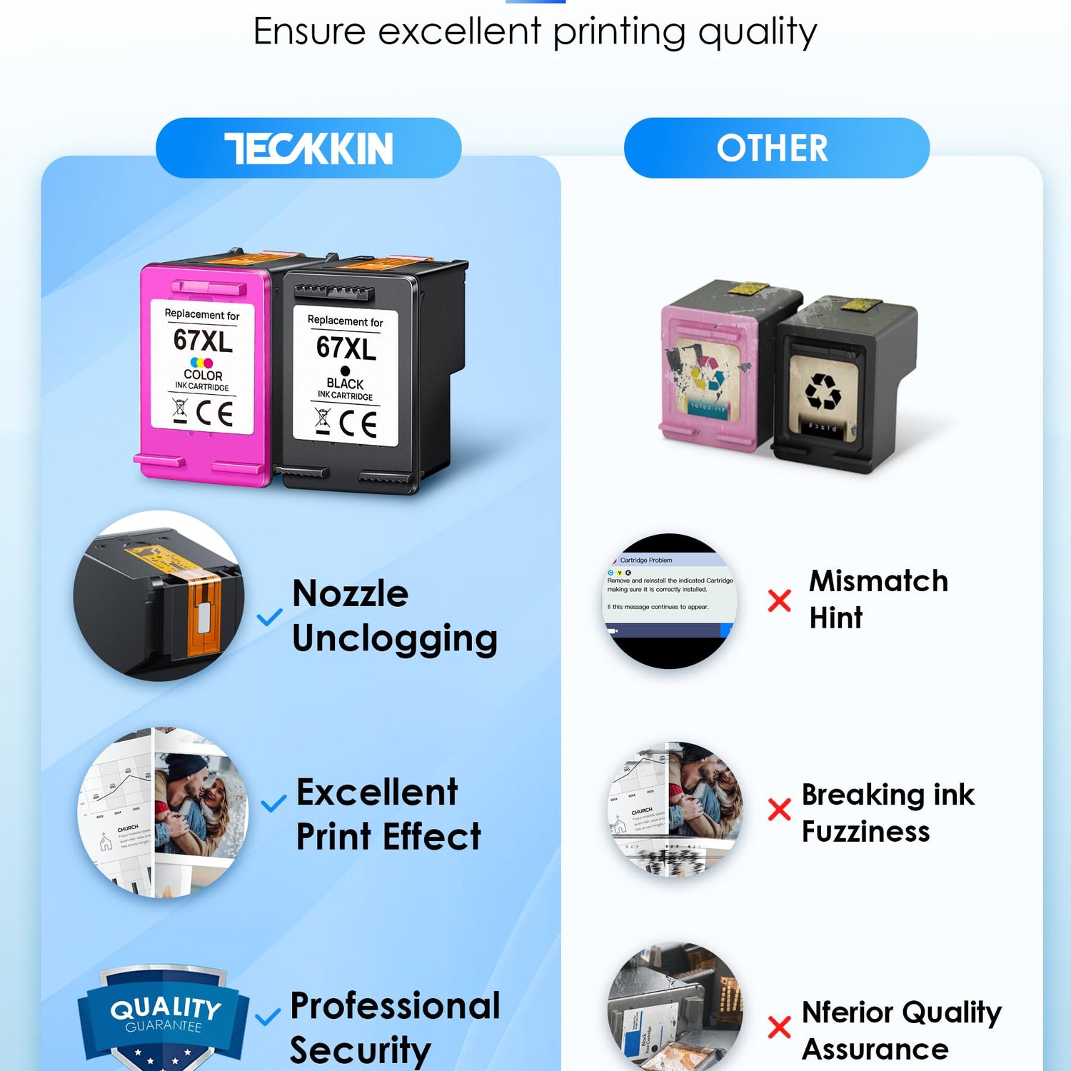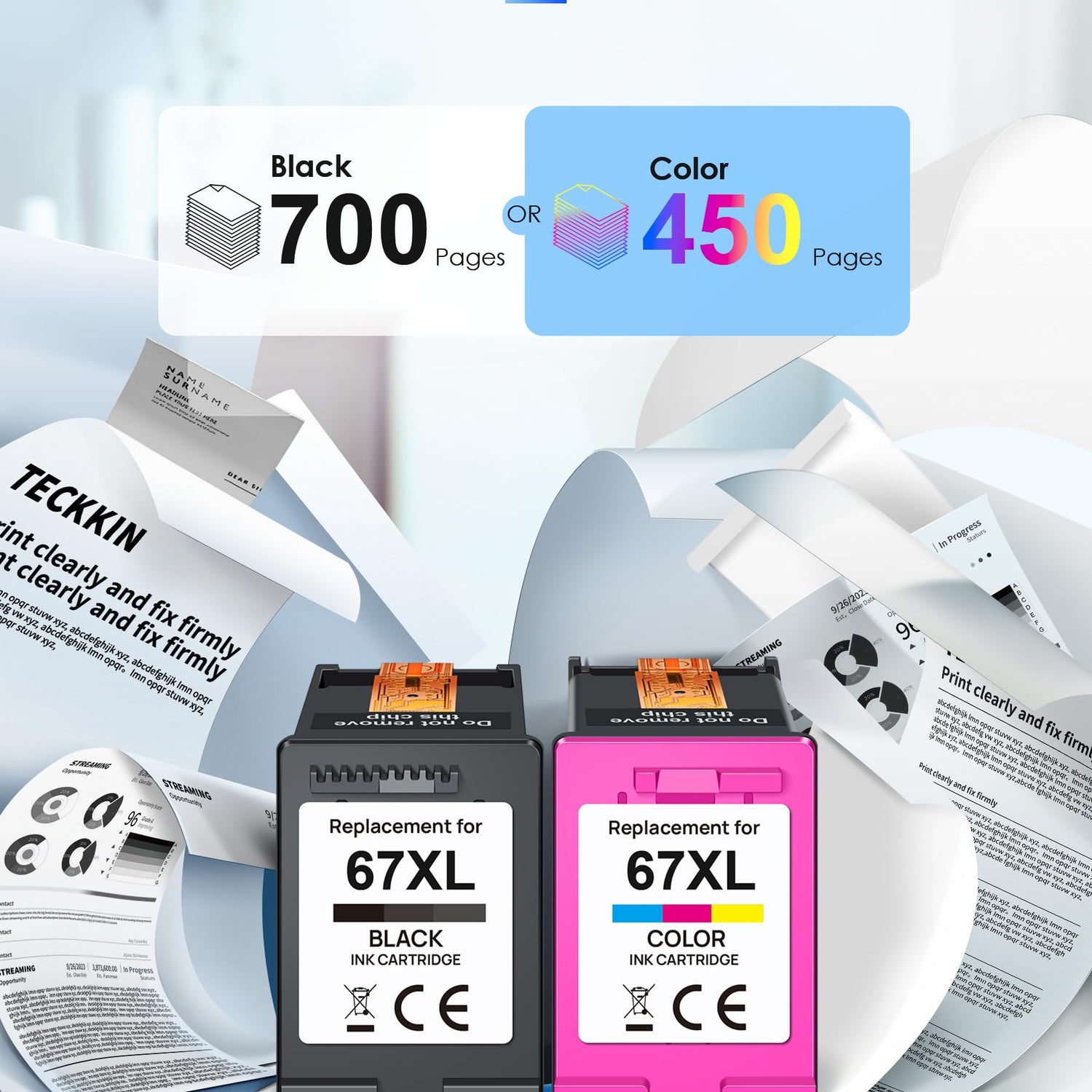 - All TECKKIN 67XL for hp ink 67 are filled with premium ink and equipped with the latest upgrade intelligent chips, which is matched with advanced production technology and strict quality inspection process to ensure the high printing quality of each 67XL ink cartridge. Bring you clear print text and bright vibrant images