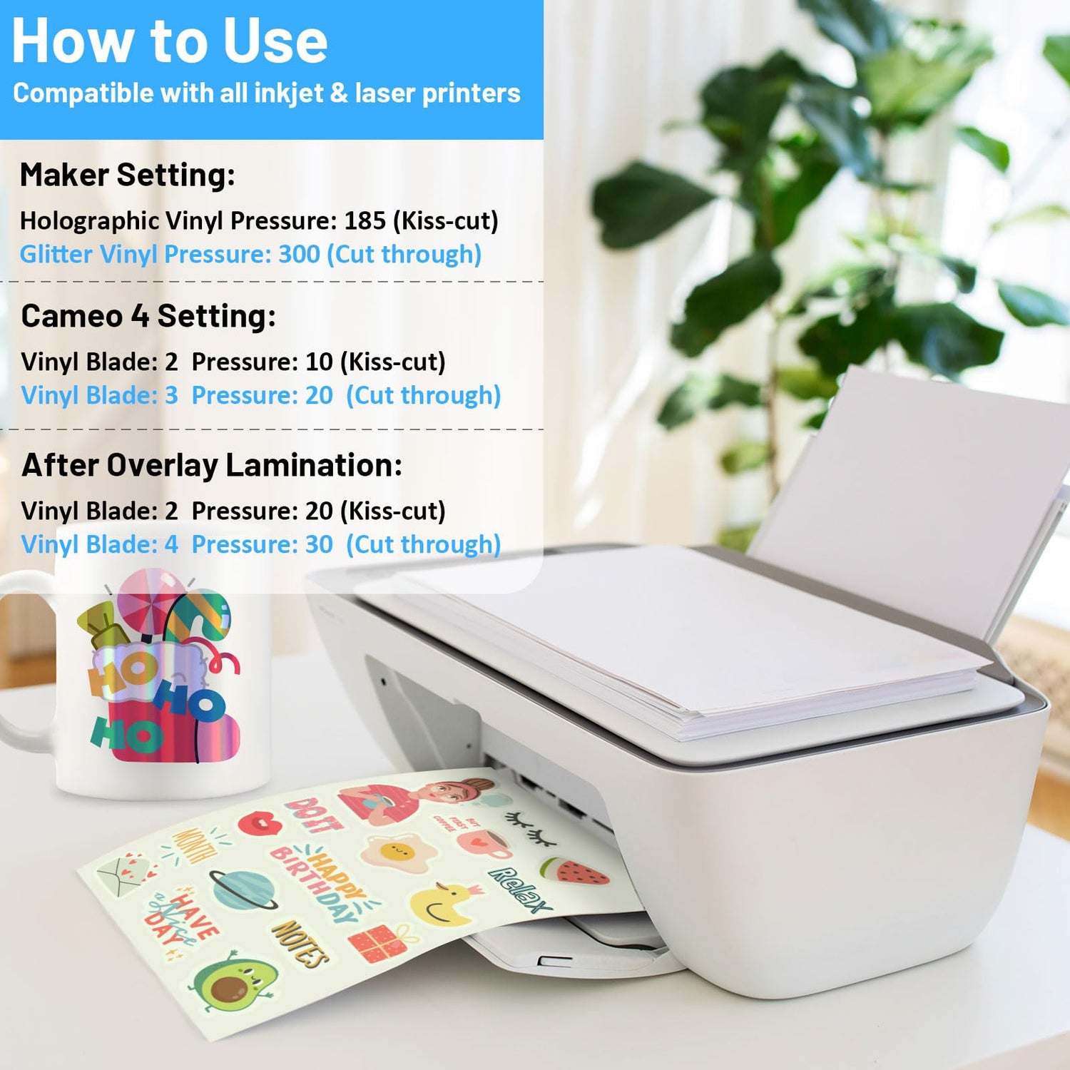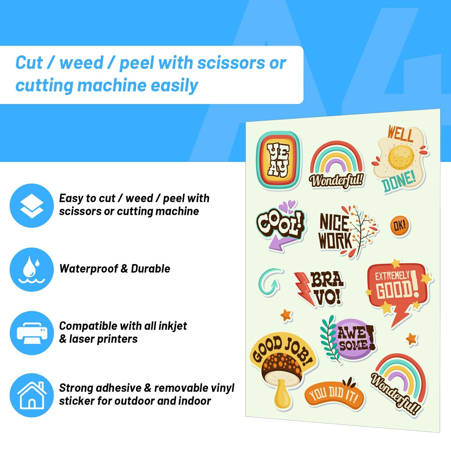 - Easy to Use with Printers & Cutters - This Inkjet printable vinyl sticker paper in a standard size of 8.26" x 11.69" can be used for inkjet printer. It’s also compatible with all craft cutters and easy to cut with a scissors.