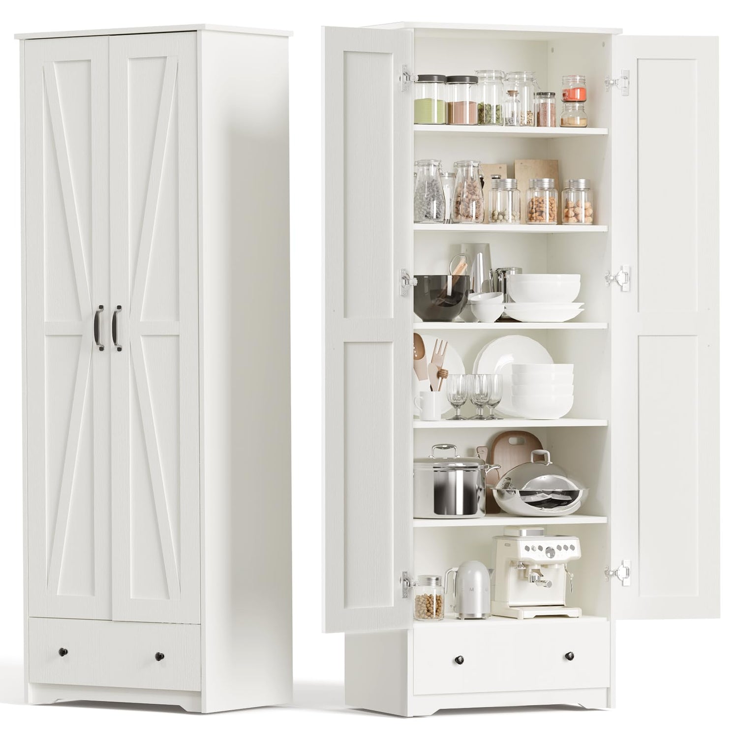 Details: Introducing the Teekyooly Farmhouse Kitchen Pantry Cabinet, your ultimate storage solution. This 70" tall, large wood cabinet is perfect for your kitchen, bathroom, or dining room. With six adjustable wood shelves, it offers massive storage capacity, measuring 25*15.35*70 inch. Whether you're organizing food, dishes, or more, this cabinet transforms any corner or closet into a neat and tidy space effortlessly. Designed with a charming farmhouse style, our pantry cabinet features 2 barn doors, a spacious drawer, white wood grain panels, and sleek black metal hardware. This piece adds a cozy, vintage touch to any room, be it your kitchen, bathroom, or dining area. The versatile use of this cabinet extends beyond the kitchen. Use it as a hutch in your dining room, a storage solution in your bathroom, or a functional closet organizer. Its adaptable design fits perfectly in any room, offering stylish and practical storage for food, dishes, towels, and more. Built to last, this cabinet can hold up to 270 lbs. The 15mm thick wood shelves won't bend over time, ensuring durability. Pre-drilled holes make assembly a breeze, and the anti-tip design guarantees safety for your family. Perfect for any corner or space needing a sturdy storage solution. We ensure quick shipping and excellent support. Our dedicated customer service team is available 24/7 to address any questions or concerns. Choose Teekyooly for a hassle-free experience with your new kitchen storage cabinets.