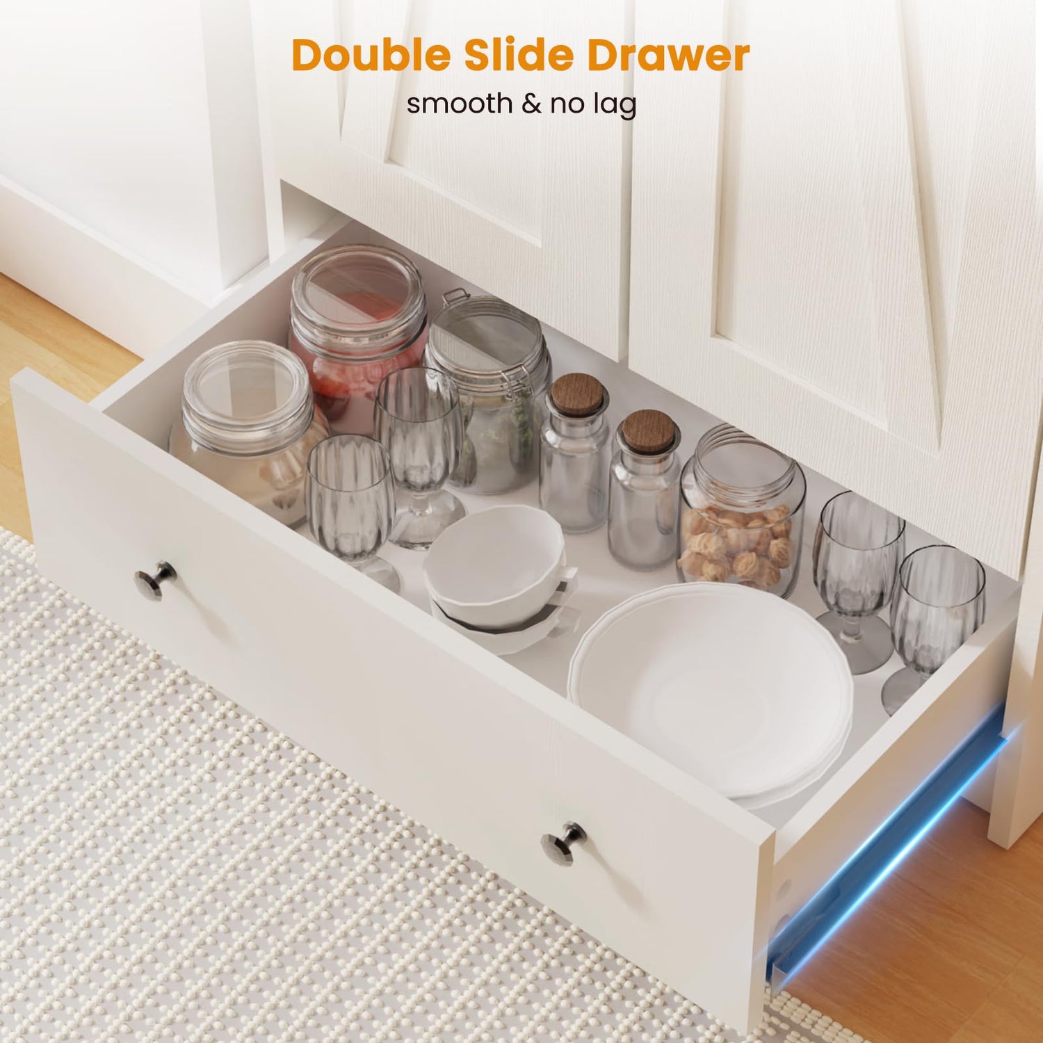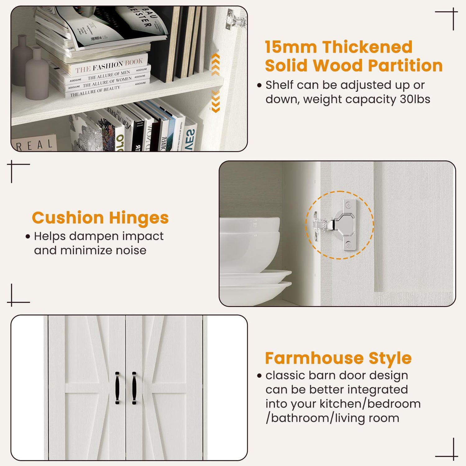 - Charming Farmhouse Design: Embrace the warmth and charm of farmhouse style with our pantry cabinet. Featuring 2 barn doors, a spacious drawer, white wood grain panels, and sleek black metal hardware, this piece adds a cozy, vintage touch to any room, whether it’s your kitchen, bathroom, or dining area