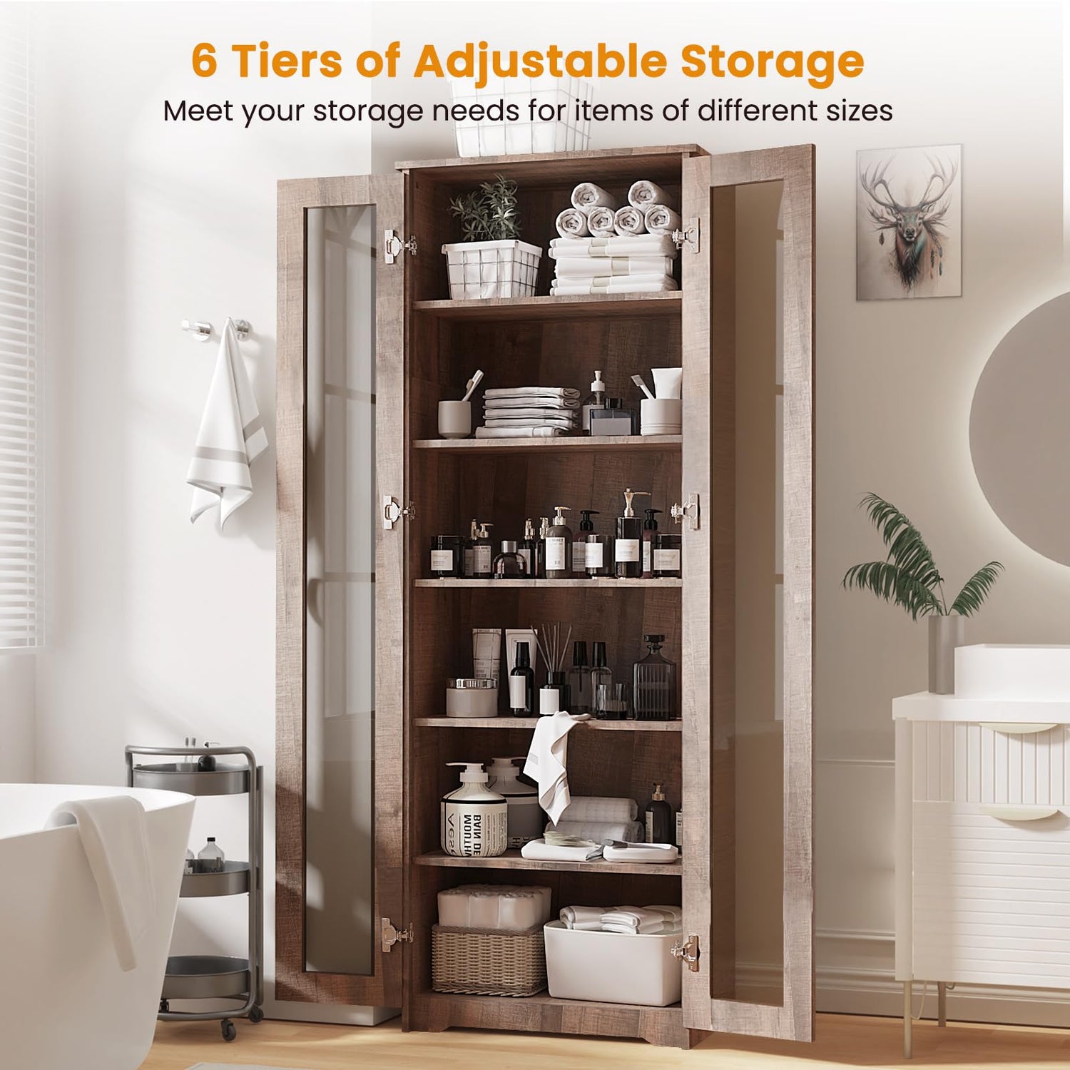 - Ample Storage Space: The Teekyooly 70 inch tall Storage Pantry Cabinet offers generous storage with six adjustable shelves, perfect for organizing your essentials. Measuring 25*15.35*70 inch, this white cabinet is ideal for storing food, dishes, towels, and more, keeping your kitchen, bathroom, or dining room neat and tidy