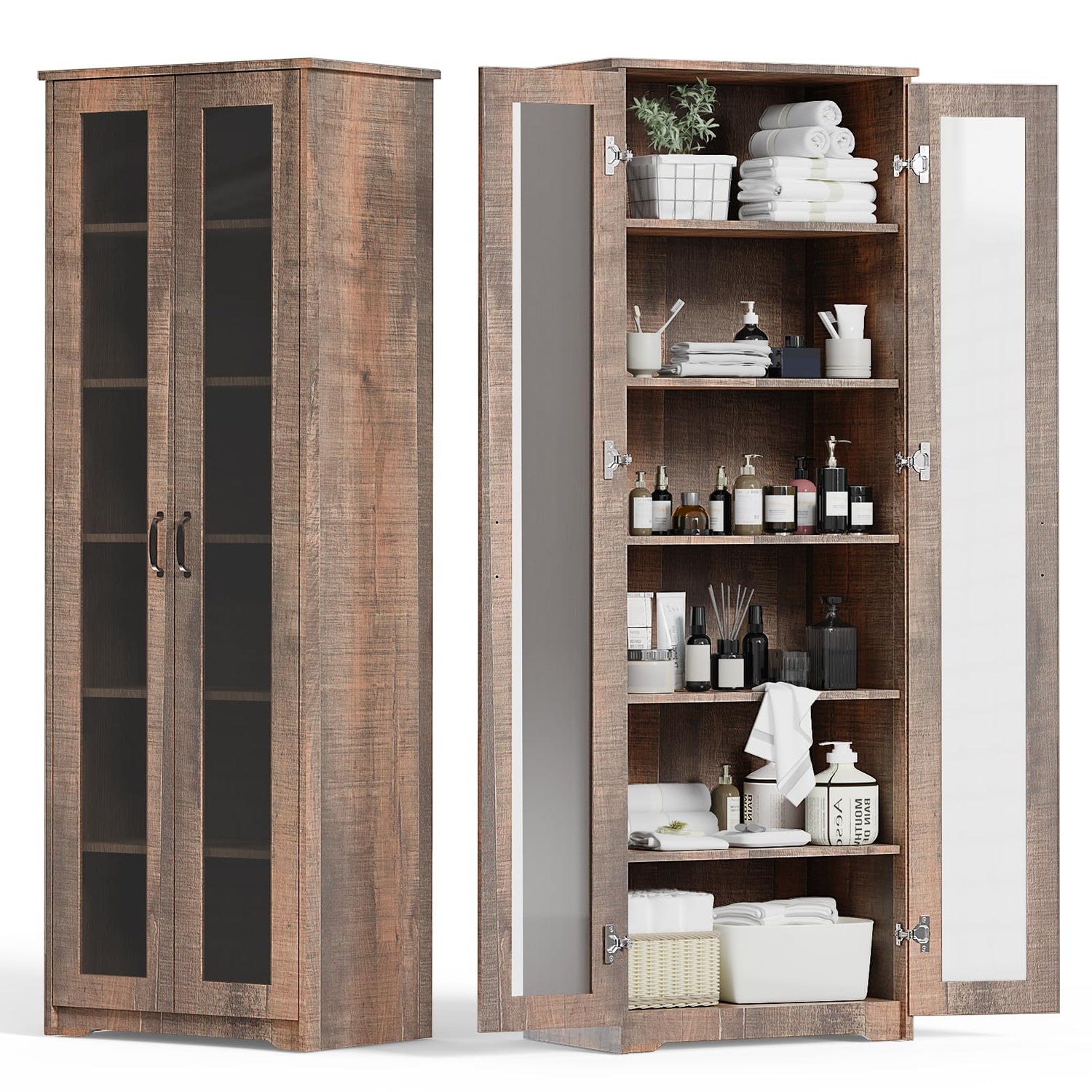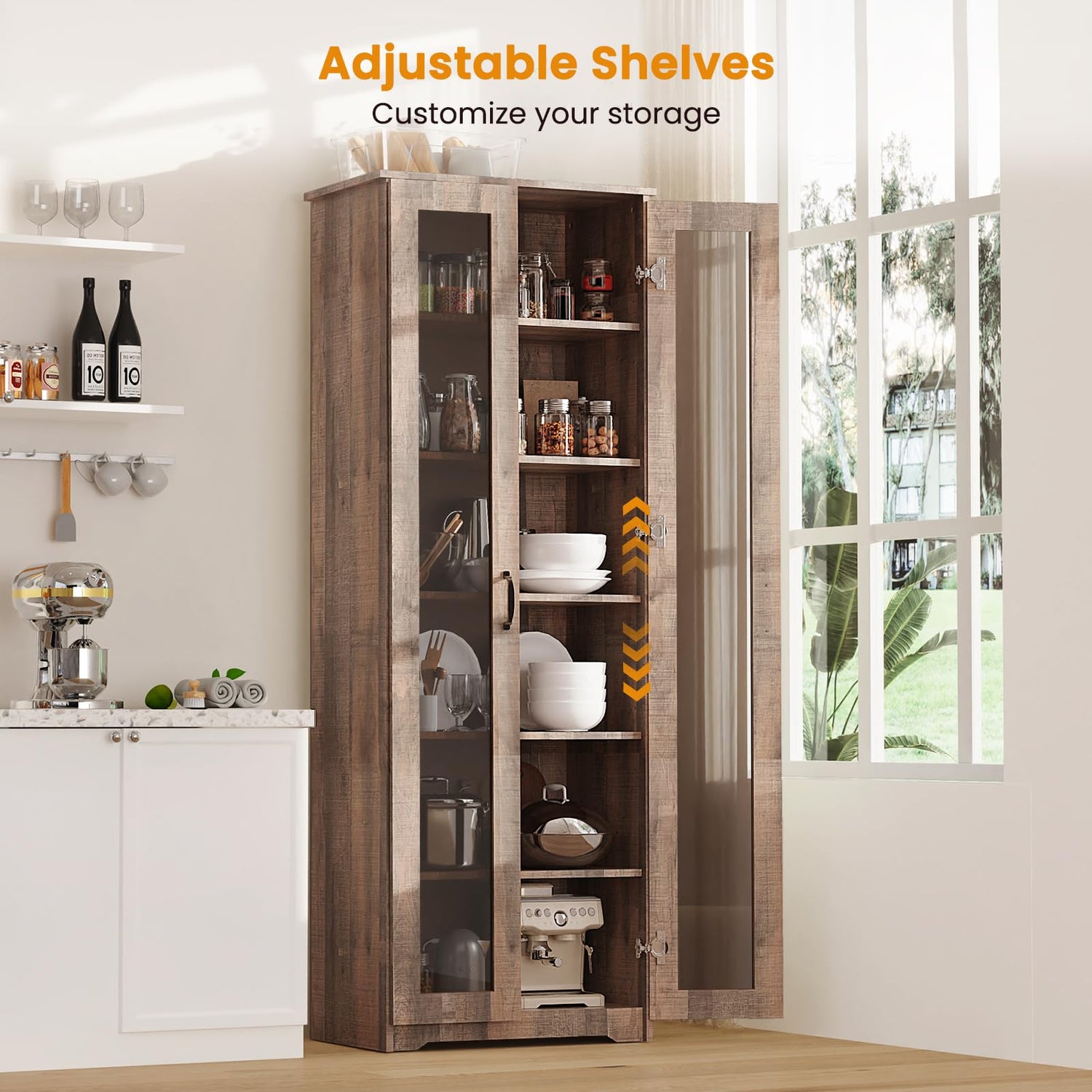Teekyooly 70" Tall Display Cabinet Storage, Pantry Cabinet with 2 Doors and 6 Adjustable Shelves, Standing Utility Cabinet for Dining Room, Food Storage and Kitchen, Clear and Brown