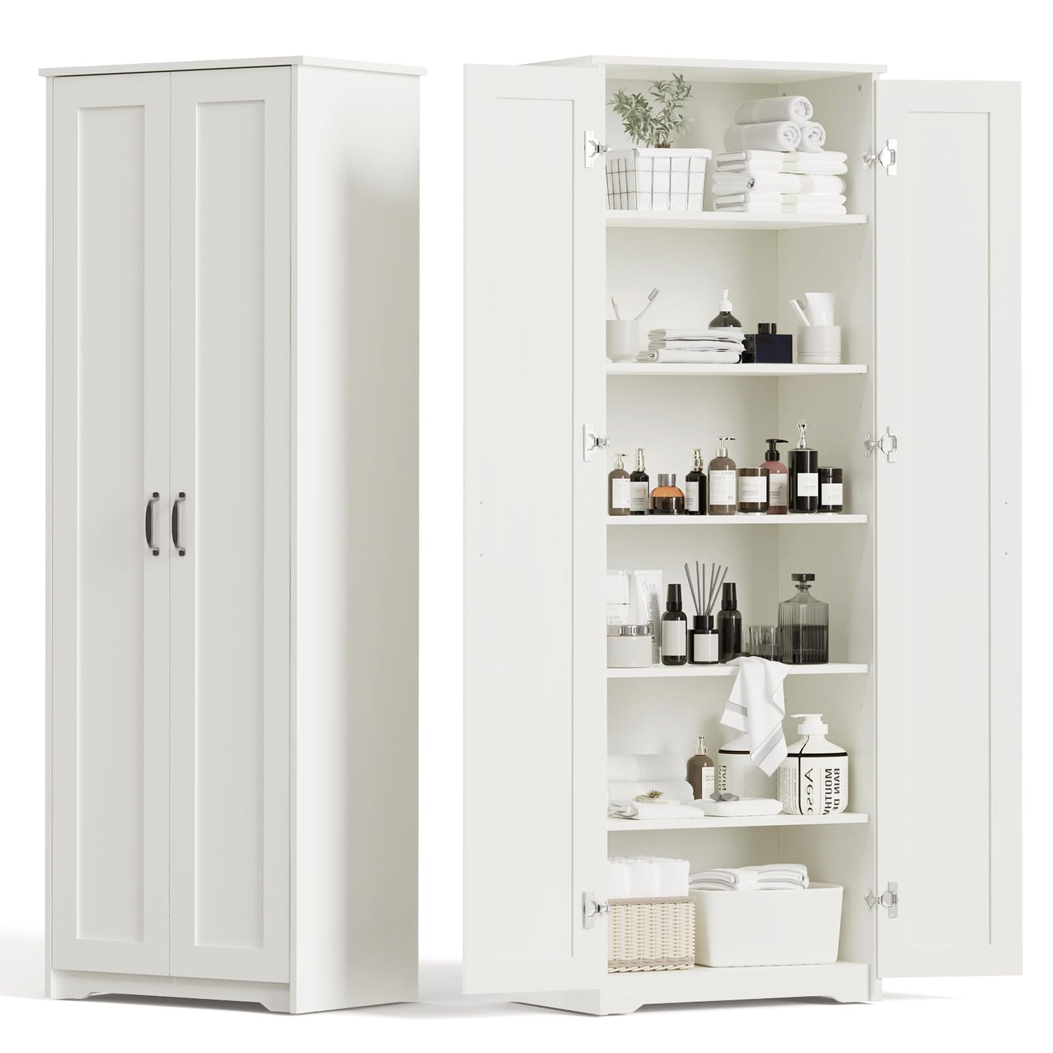 Details: Teekyooly 70" Tall Storage Pantry Cabinet, Bathroom Floor Organizer Storage Cabinet with 2 Doors and 6 Adjustable Shelves, Standing Utility Cabinet for Dining Room, Food Storage and Kitchen, White