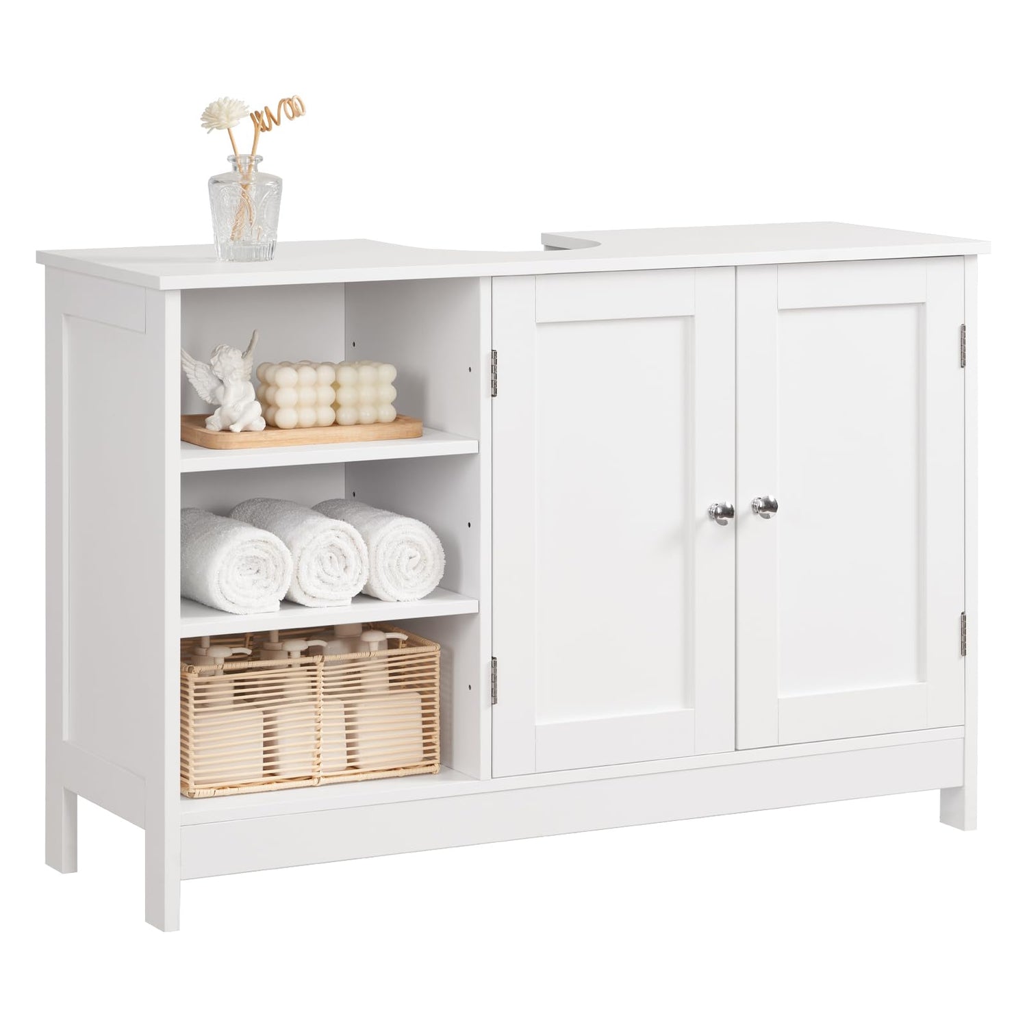 - ⭐Space-Saving Design: With a U-shaped cutout, the under sink cabinet fits perfectly under the bathroom sink and hides the unsightly plumbing. Three open shelves is perfect for commonly used bathroom essentials—like cleaning supplies or toiletries, and the enclosed cabinet on the right provide hidden, dust-free storage for toilet paper and personal essentials. Keep your bathroom looking neat while ensuring necessities are always within reach
