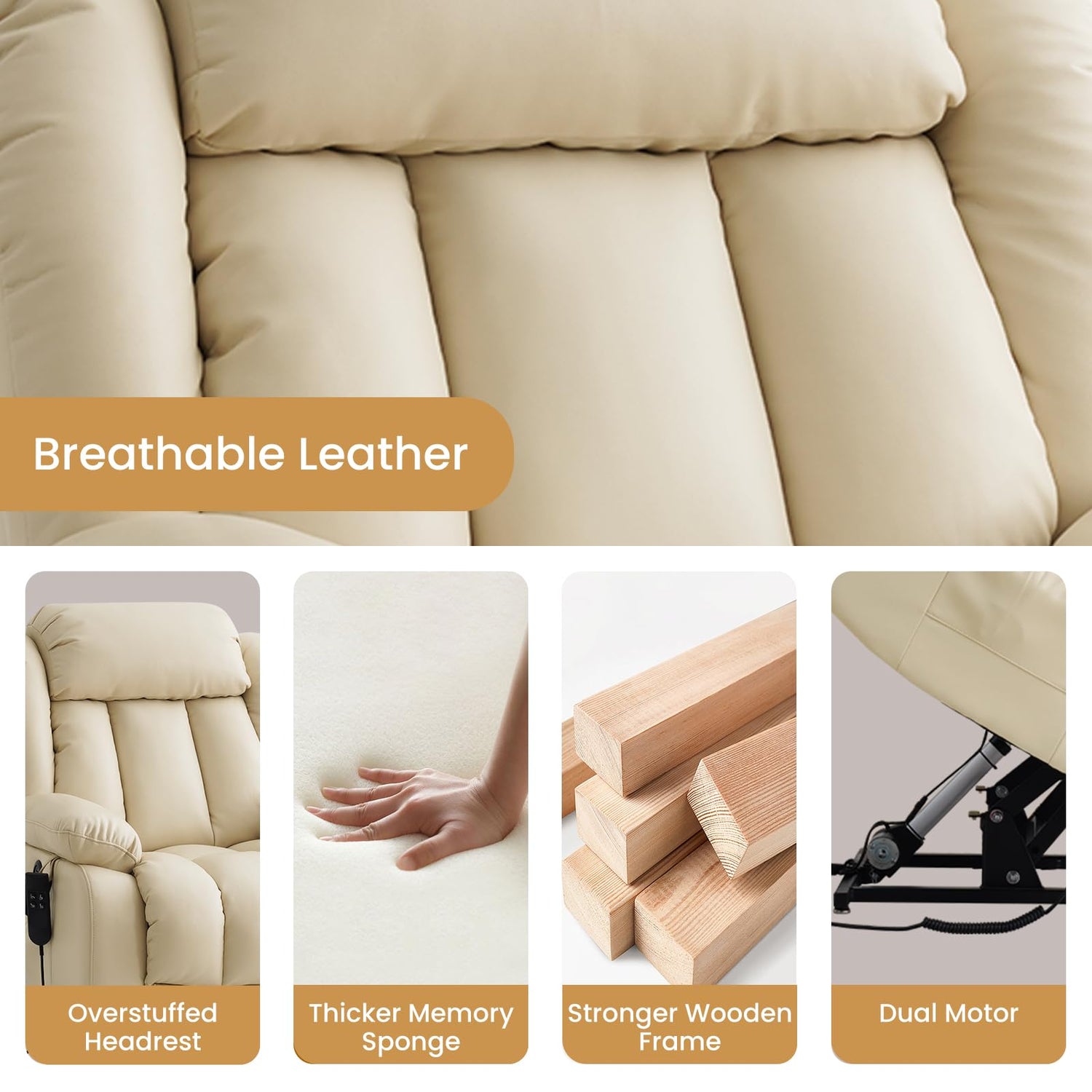 TEKAMON Power Lift Recliner Chair for Elderly with Heat & Massage, Dual Motor Breathable Leather Recliner, Lay Flat Sleeping Chairs with Infinite Position, RemoteControl(Beige, Extended)