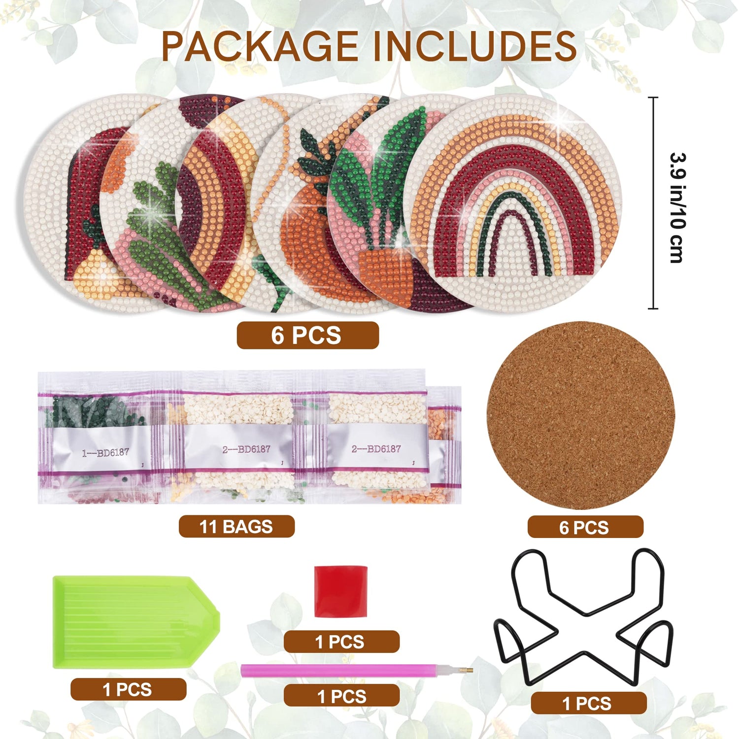 - Package Include: Diamond Painting Coaster x 6, Cork Pad x 6, Coaster Holder x 1, Colorful Diamond x 11, Clay Glue x 1, Pen x 1, Diamond Tray x 1