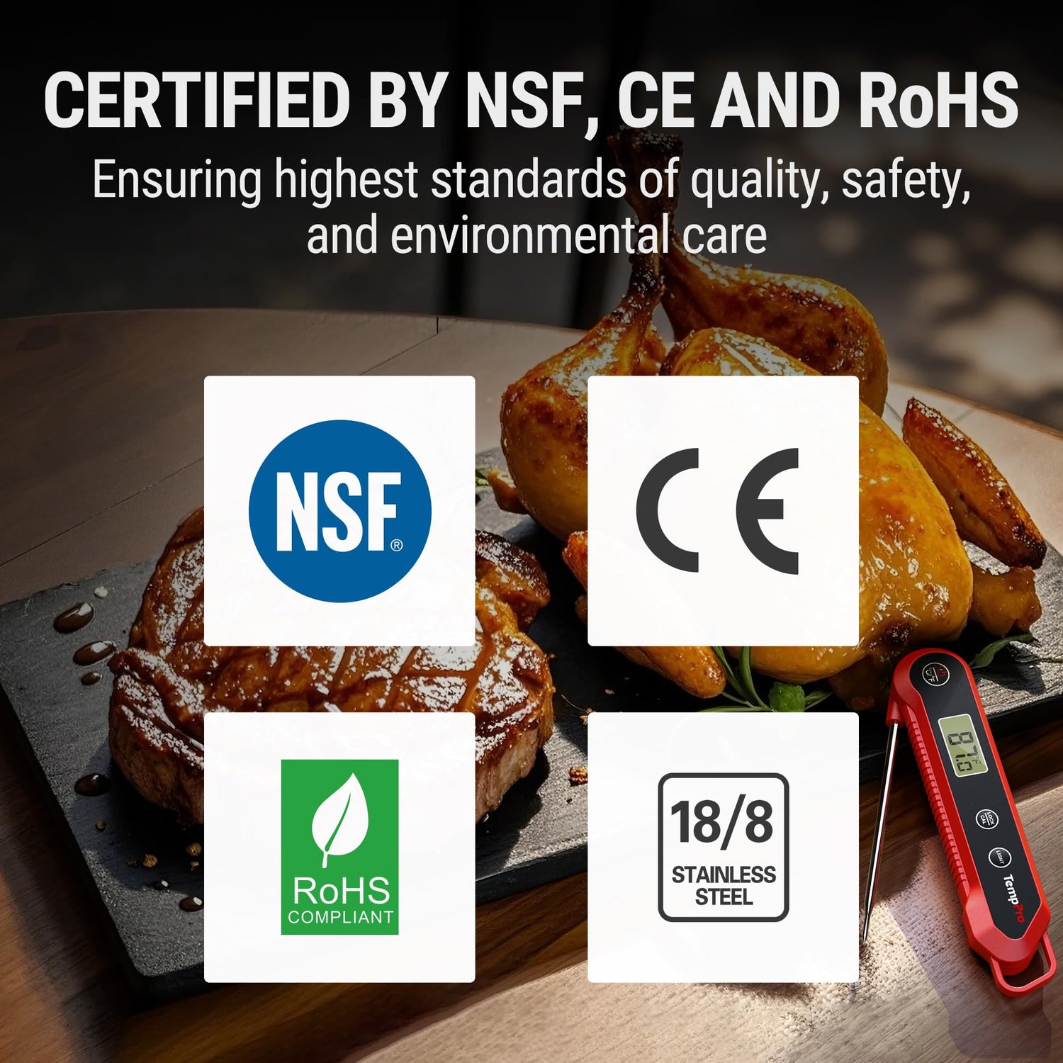 - 【Triple Certification】 NSF/FCC/CE-certified professional digital food thermometer for cooking meets commercial kitchen standards —ensuring safety, accuracy, and reliability for professional chefs and home cooks alike.