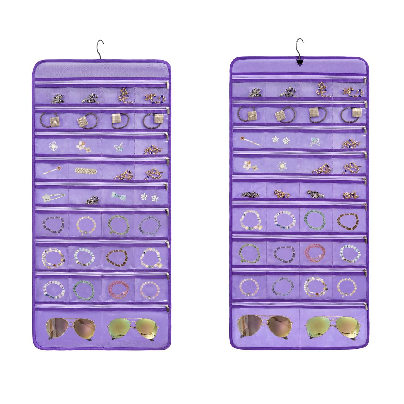 TEMUORG Travel Jewelry Organizer Dual Sided Hanging Earring Holder Bracelet Storage Rolls Rings Display Case with 68 Zippered Pockets (PURPLE)