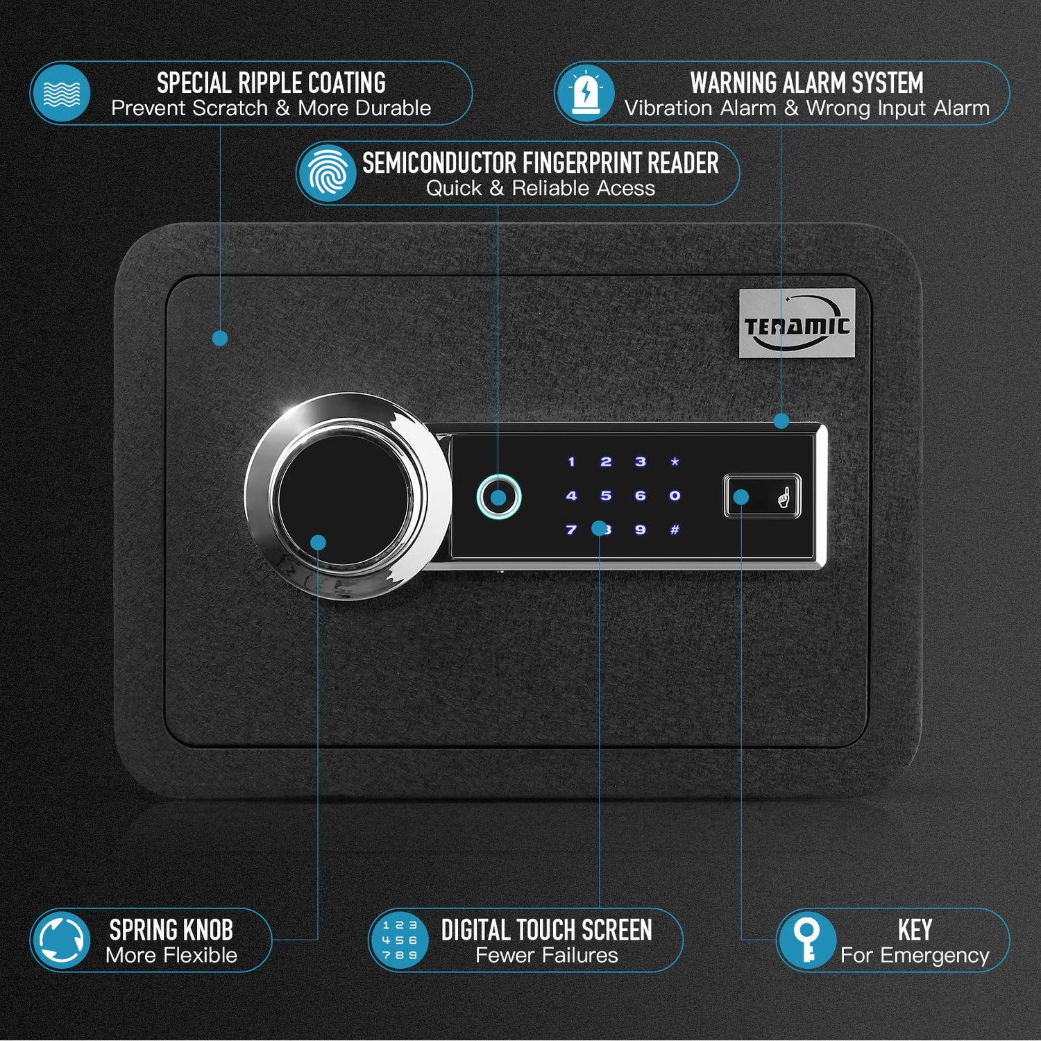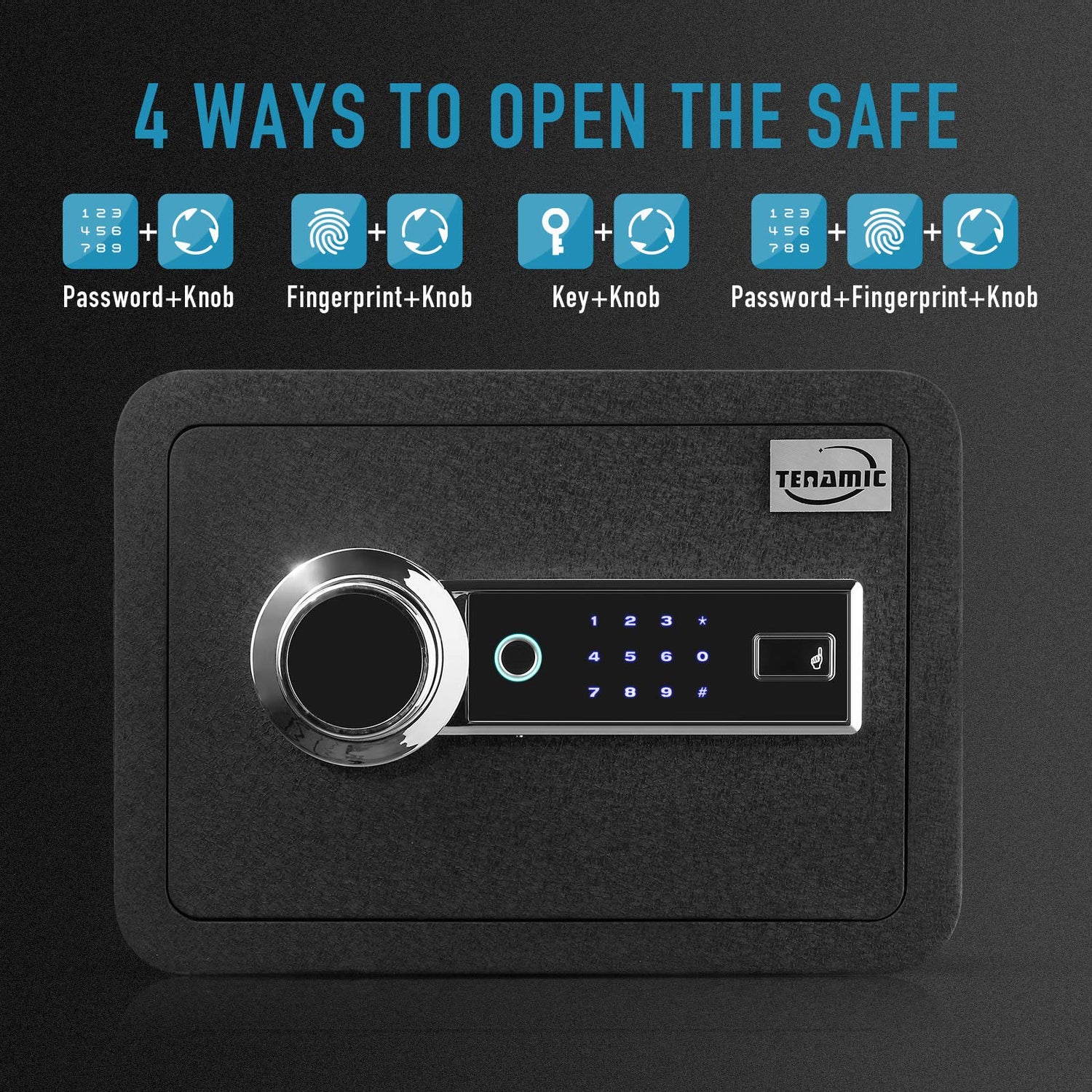 - ✅【NECESSARY ALARM SYSTEM】: Tenamic home safe has a good alarm system. 5 continuously wrong fingerprint or 3 wrong password entries will activate the warning beep for 20 seconds. Enter the correct fingerprint or password can stop the alarm.