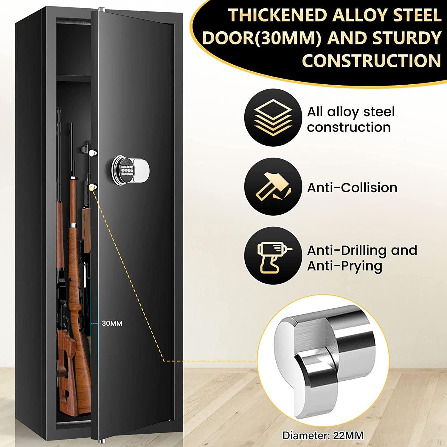 - Heavy Duty Anti-Theft Rifle Gun Safe: Large gun safe is made of solid cold rolled steel with good anti-pick, anti-rust and high temperature resistance. Gun cabinet weighs up to 71.31 lbs and comes with four 22 mm solid bolts and 30 mm thickened front door. The rifle safe is solid enough to keep firearms from being accessed by children and to deter burglars. 3 consecutive wrong entries will cause the keyboard to be locked for 20 seconds. You can set silent mode or turn on the sound if you want