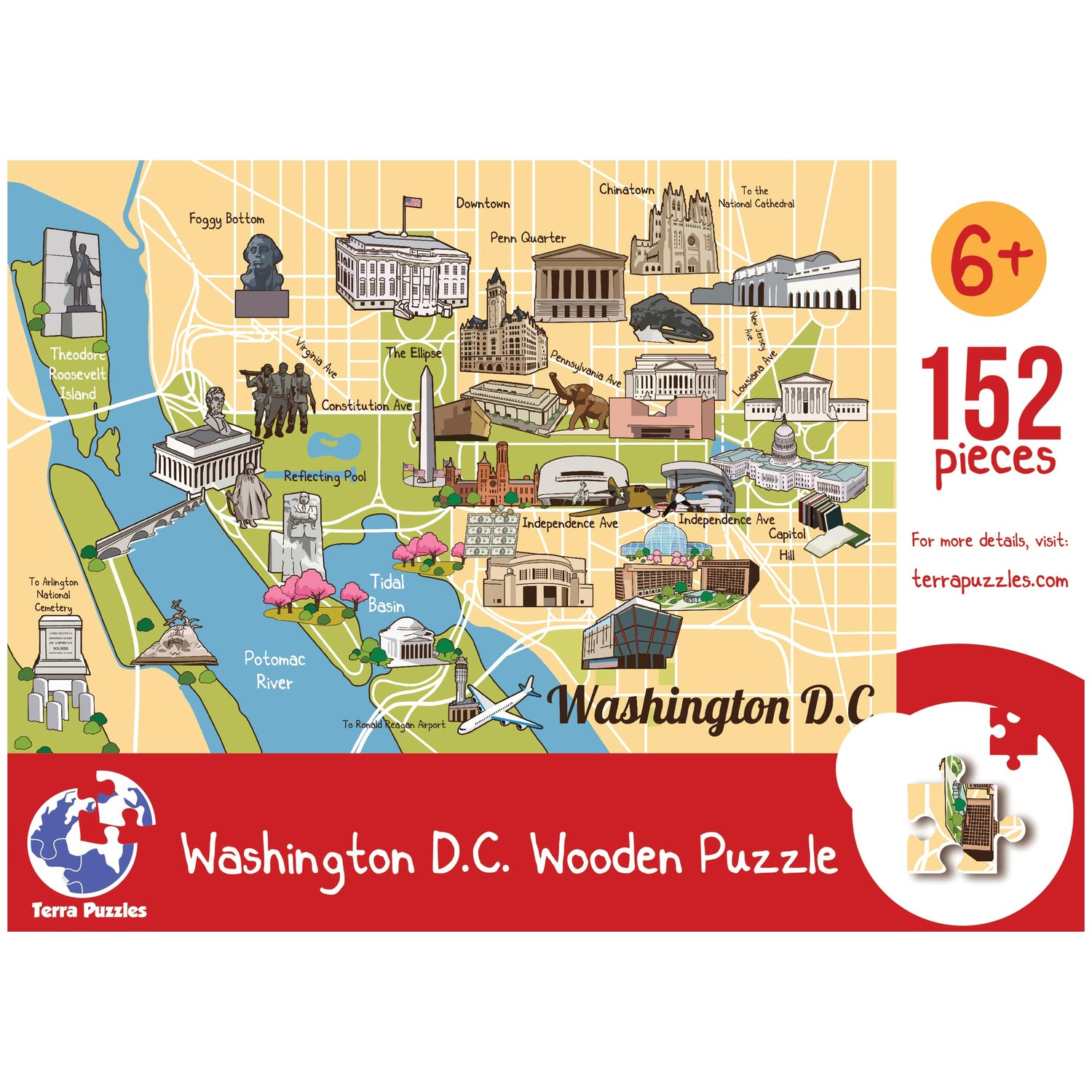 Terra Puzzles Washington DC Illustrated Map Wooden Jigsaw Puzzle - 152 Pieces | Educational Fun for Children & Adults Featuring Famous Landmarks Wood Puzzle